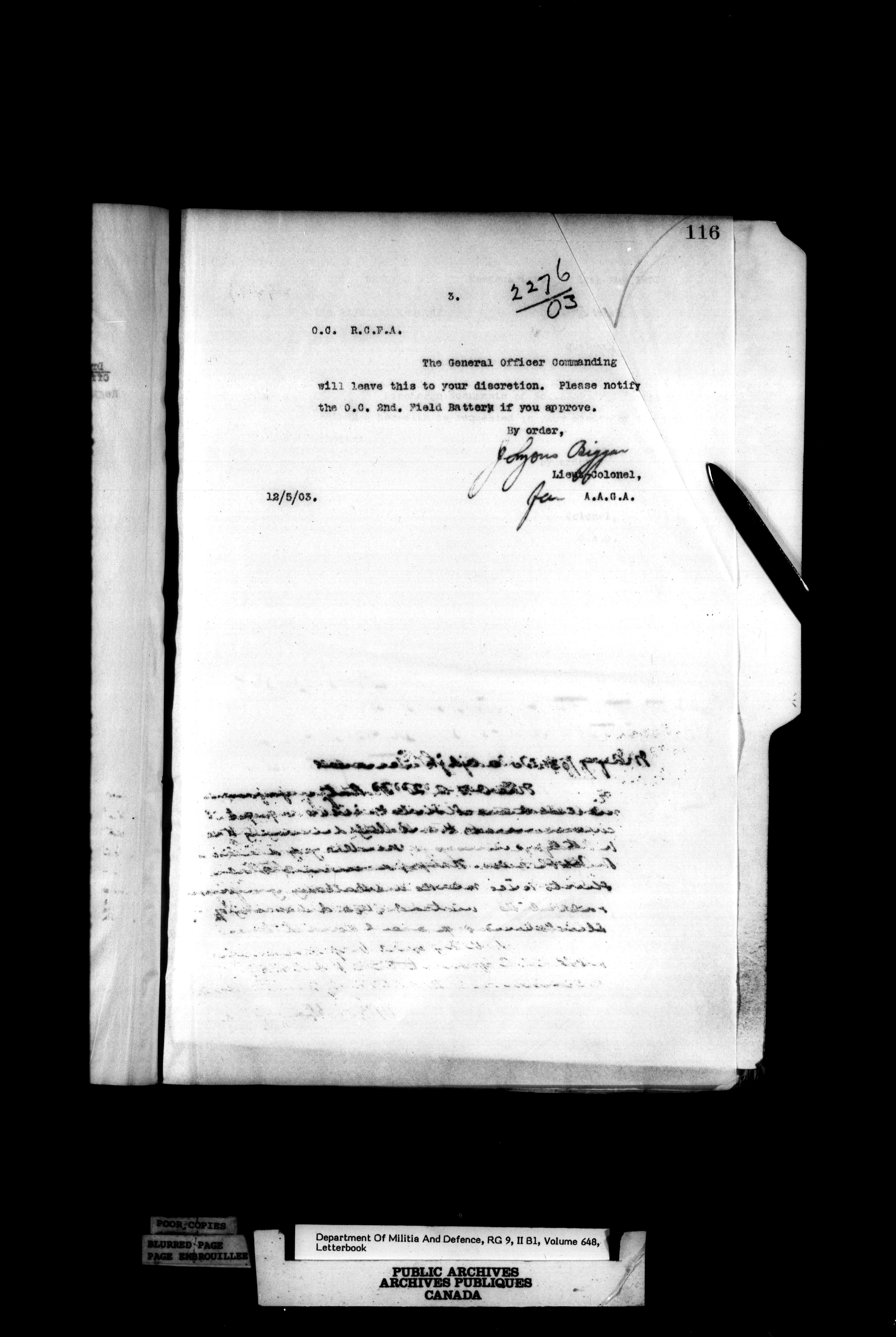 Correspondence of the General Officer Commanding (GOC) of the Canadian Militia and his predecessor, the Adjutant General - 375