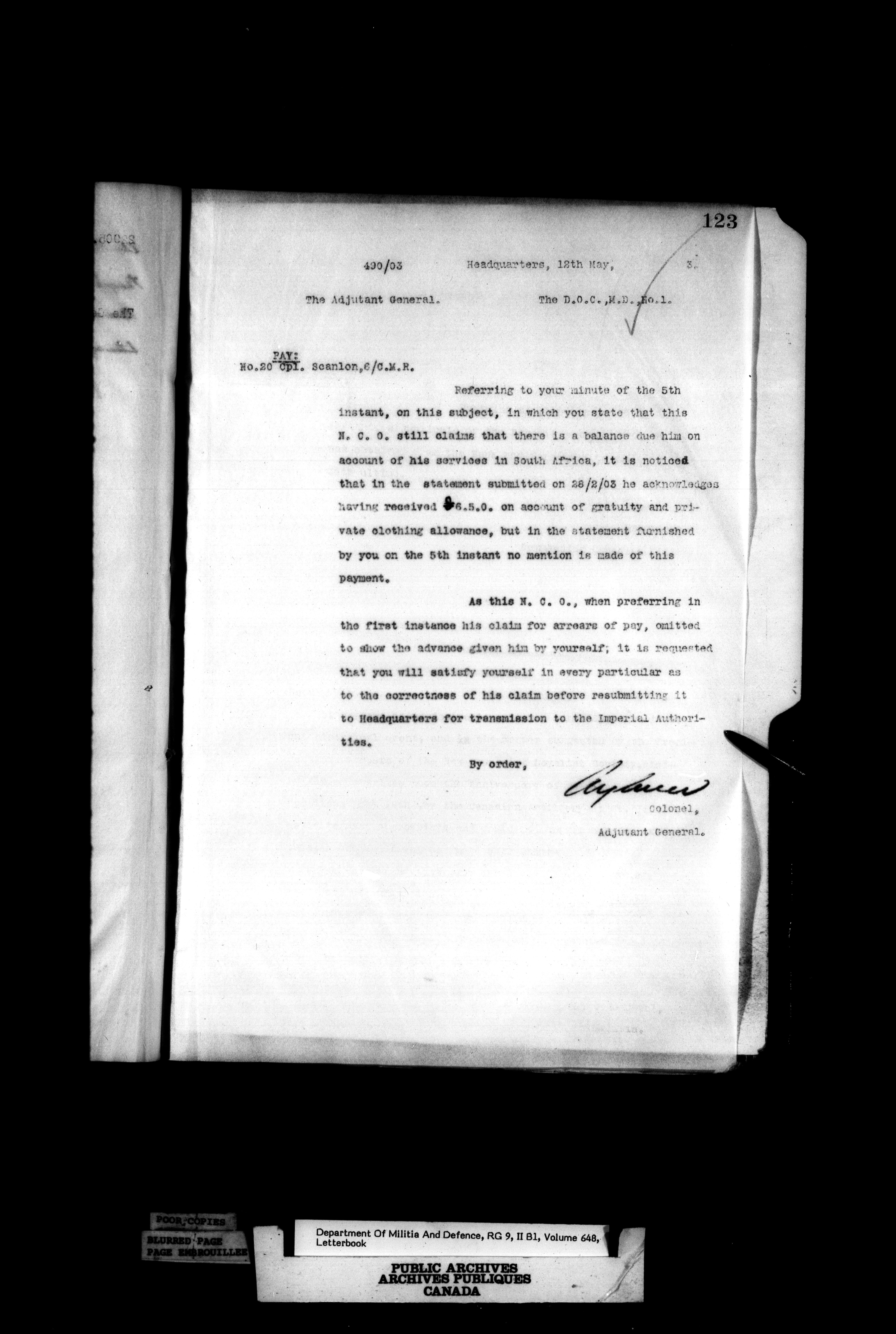 Correspondence of the General Officer Commanding (GOC) of the Canadian Militia and his predecessor, the Adjutant General - 375