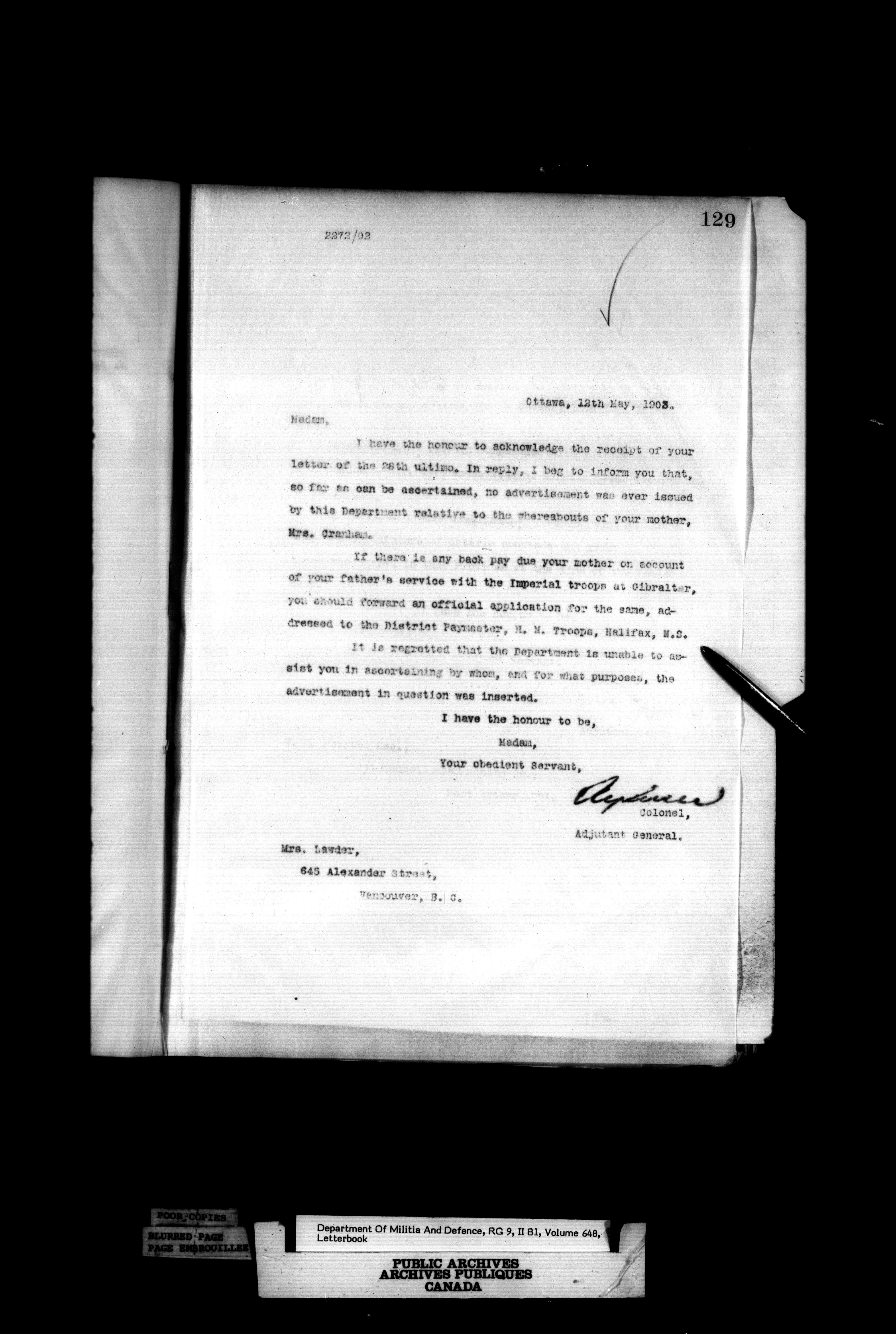 Correspondence of the General Officer Commanding (GOC) of the Canadian Militia and his predecessor, the Adjutant General - 375