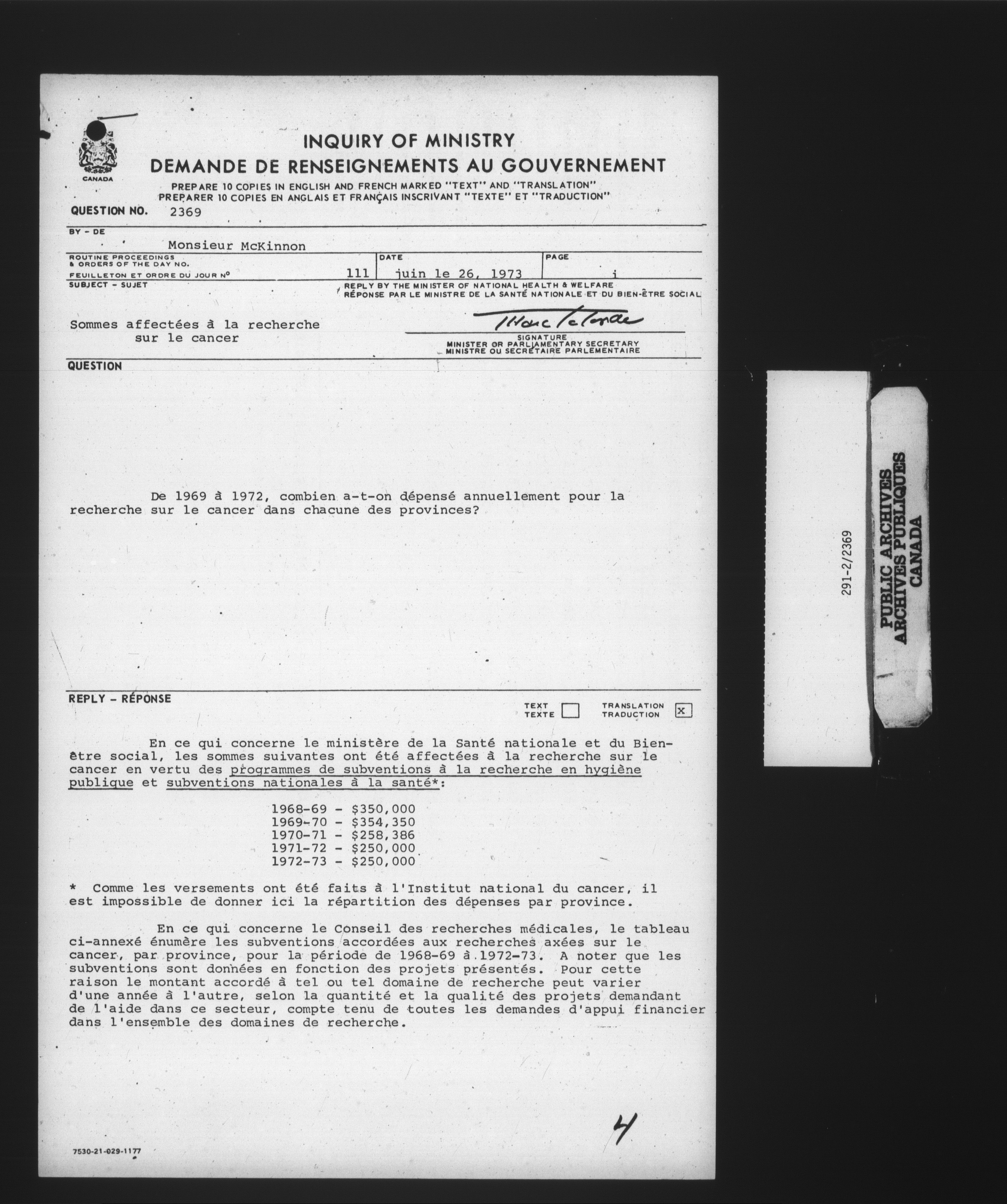 Unpublished sessional papers, 1st Session, 29th Parliament - 3833