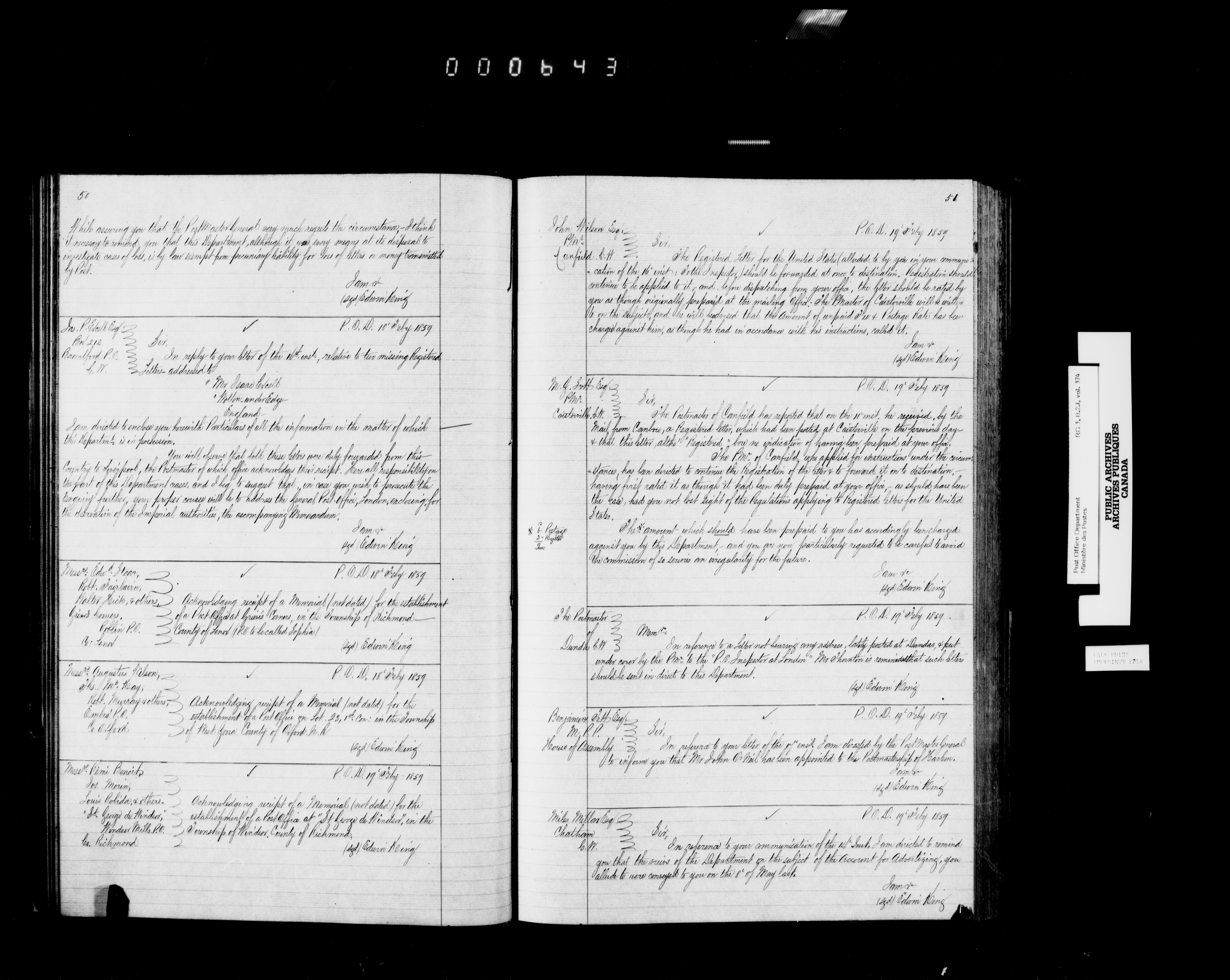 Records and general correspondence sent from the Postmaster General, 1851-1902 - 3854
