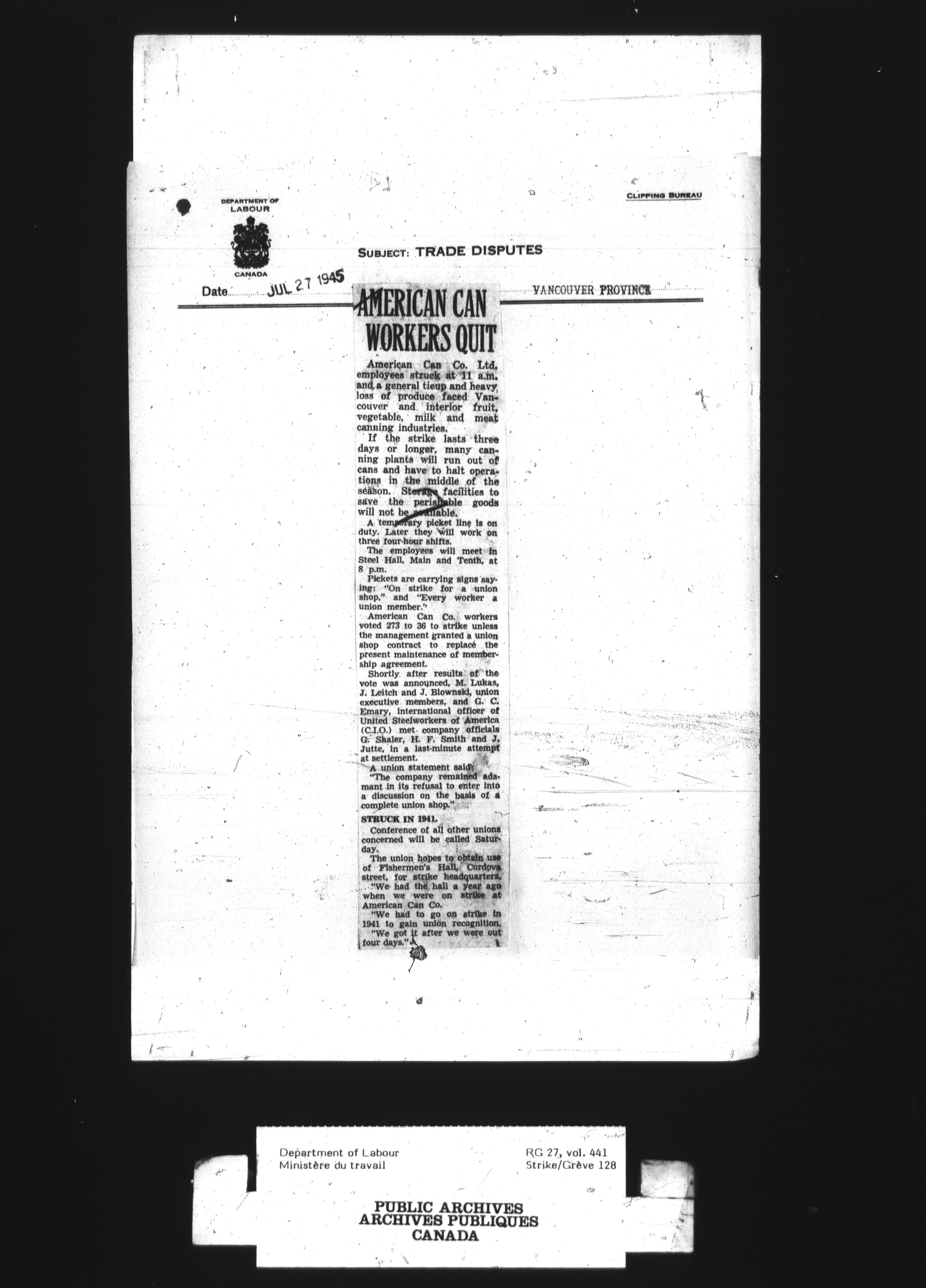 Department of Labour, Economics and Research Branch : Strikes and lockout files - 4074