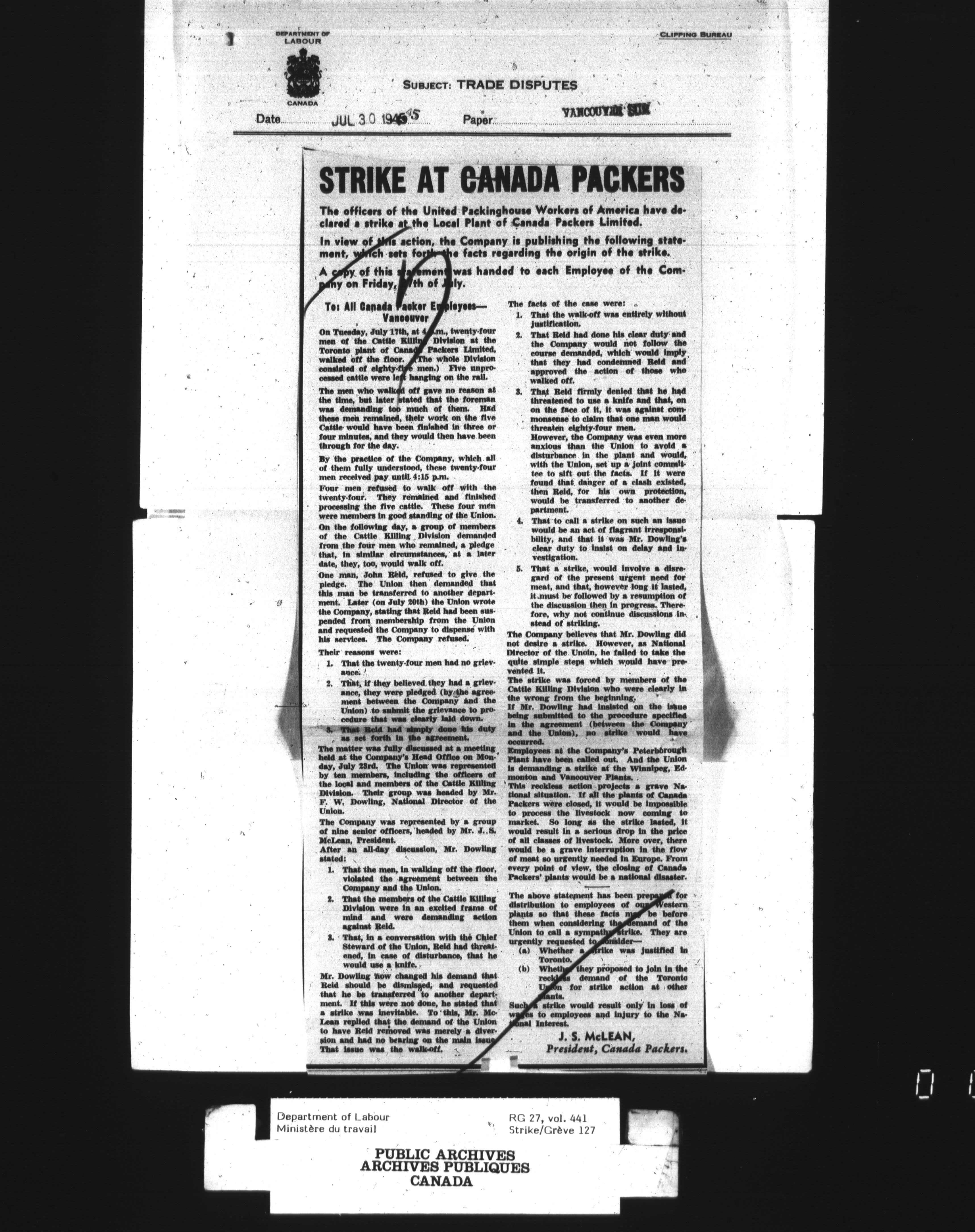 Department of Labour, Economics and Research Branch : Strikes and lockout files - 4074