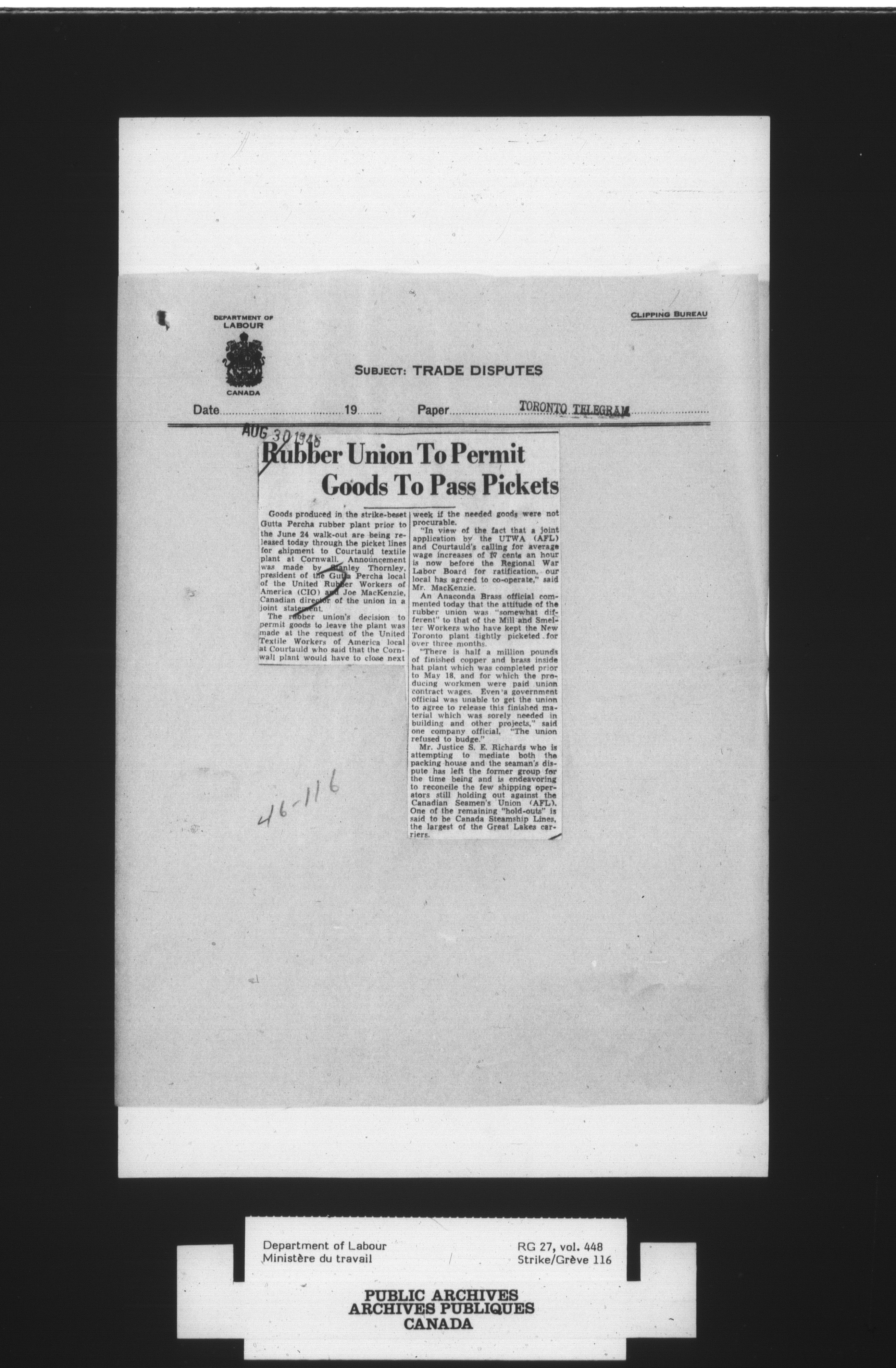 Department of Labour, Economics and Research Branch : Strikes and lockout files : T-4081