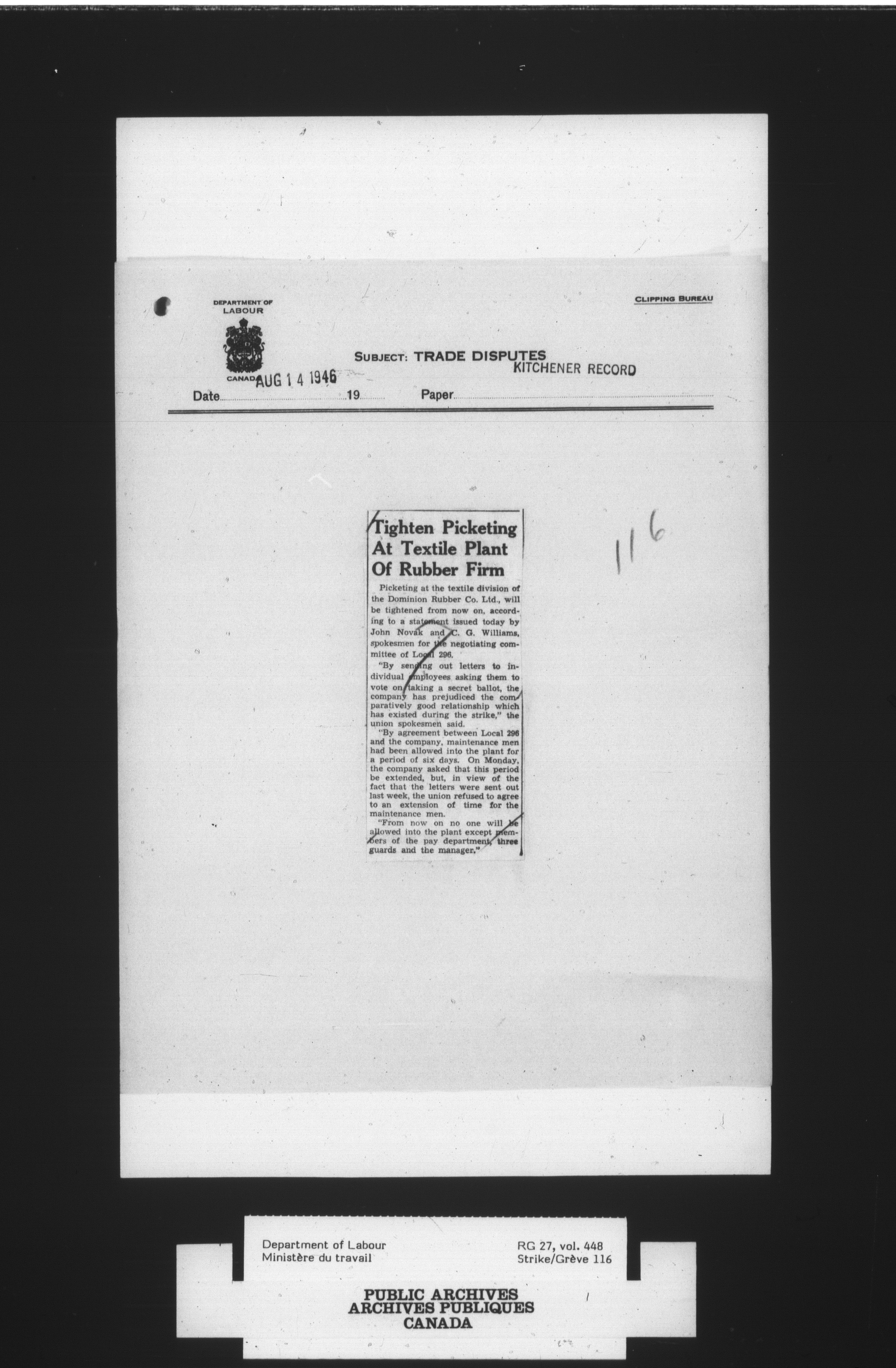 Department of Labour, Economics and Research Branch : Strikes and lockout files : T-4081