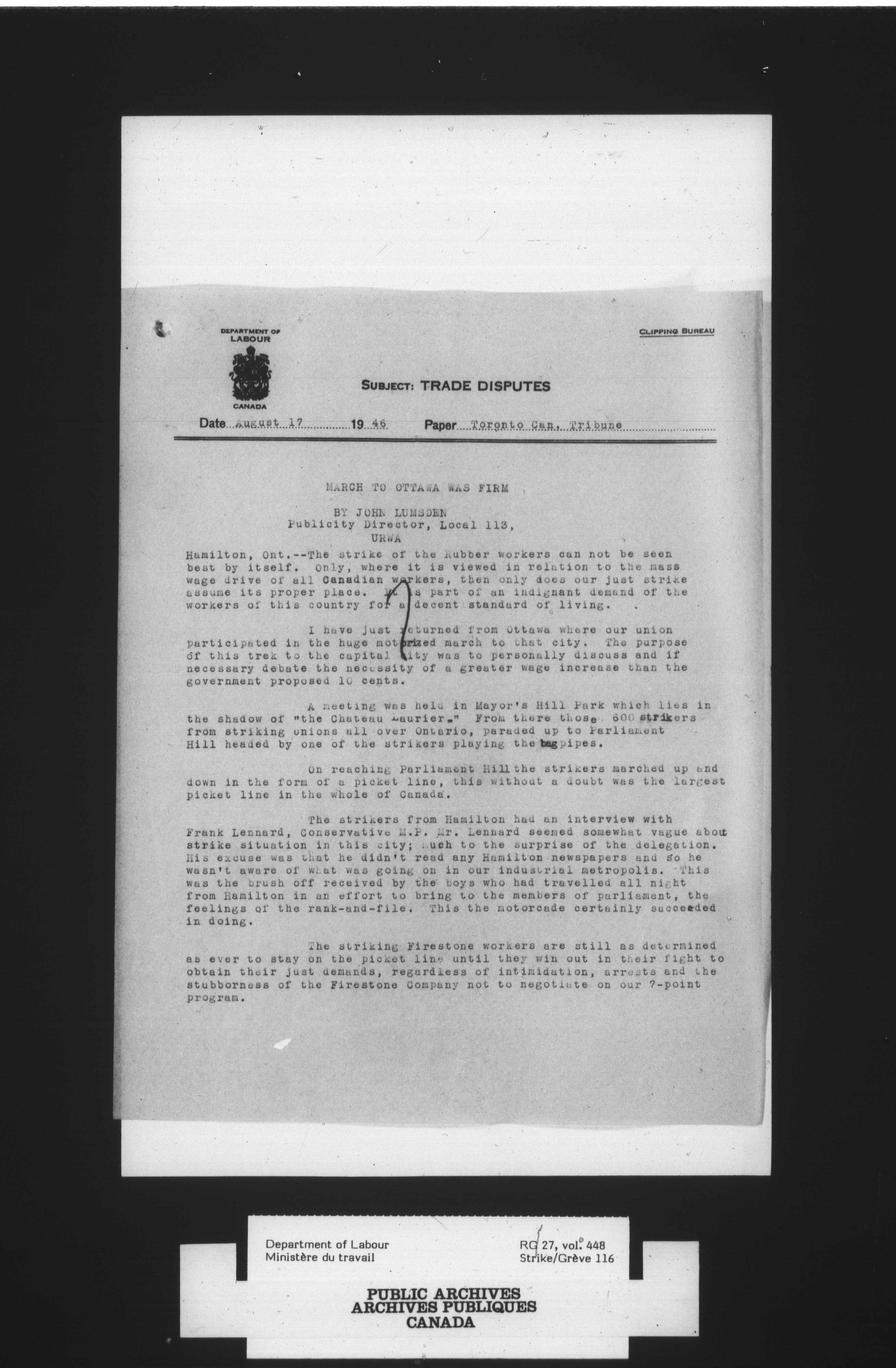 Department of Labour, Economics and Research Branch : Strikes and lockout files : T-4081