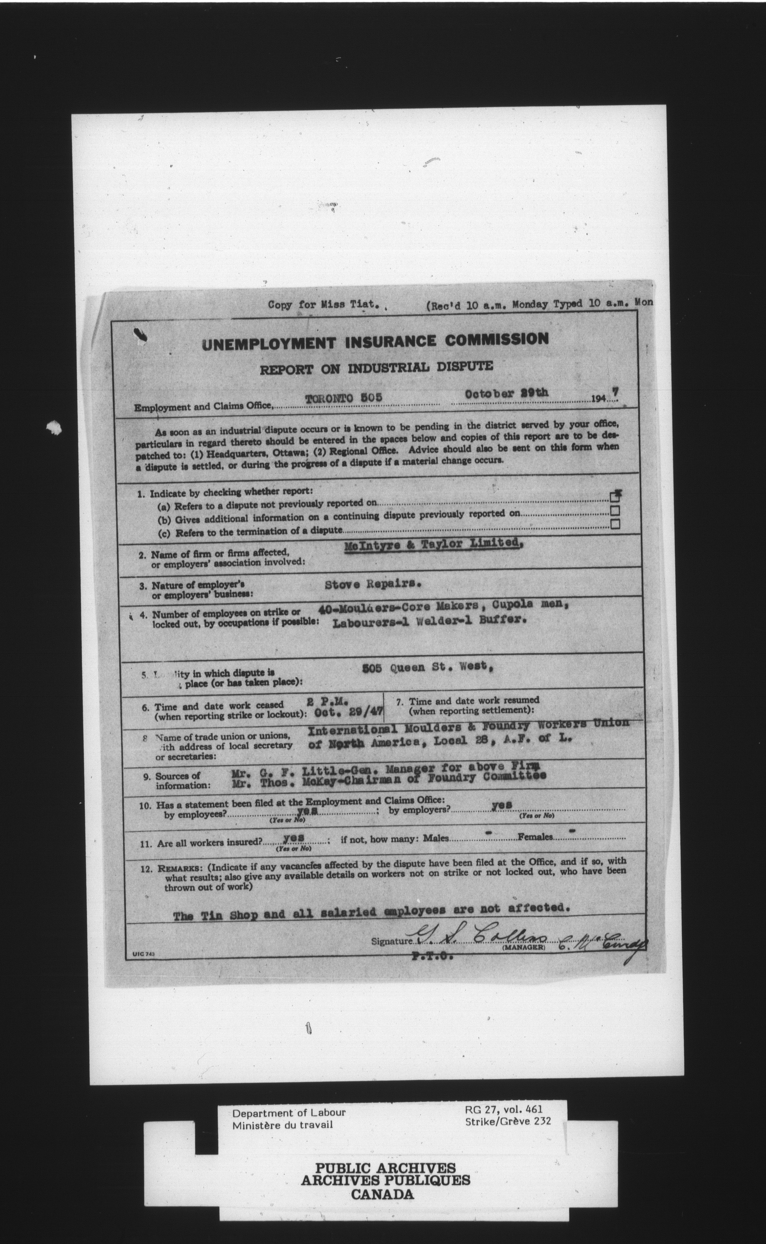 Department of Labour, Economics and Research Branch : Strikes and lockout files - 4092