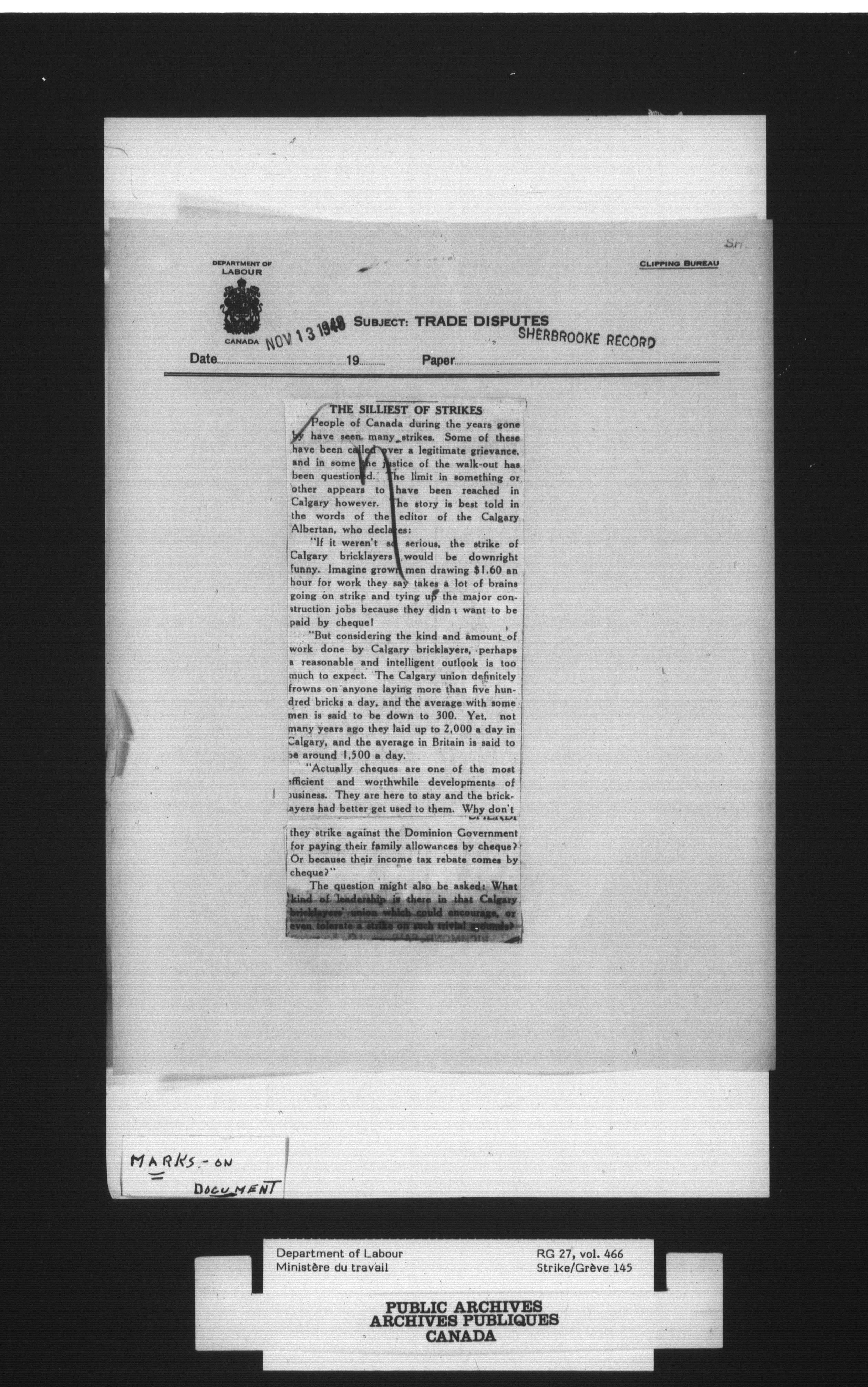 Department of Labour, Economics and Research Branch : Strikes and lockout files - 4097