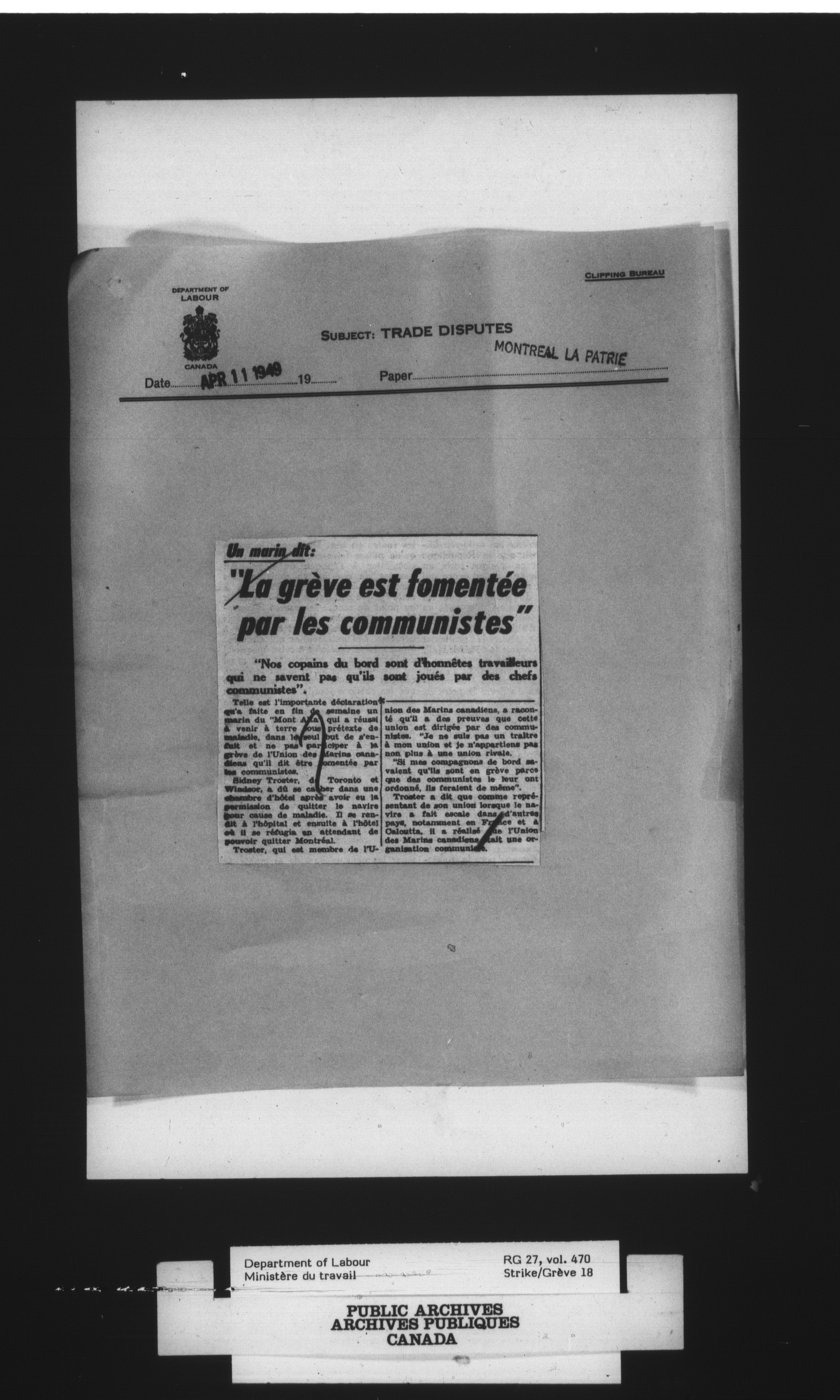 Department of Labour, Economics and Research Branch : Strikes and lockout files - 4099