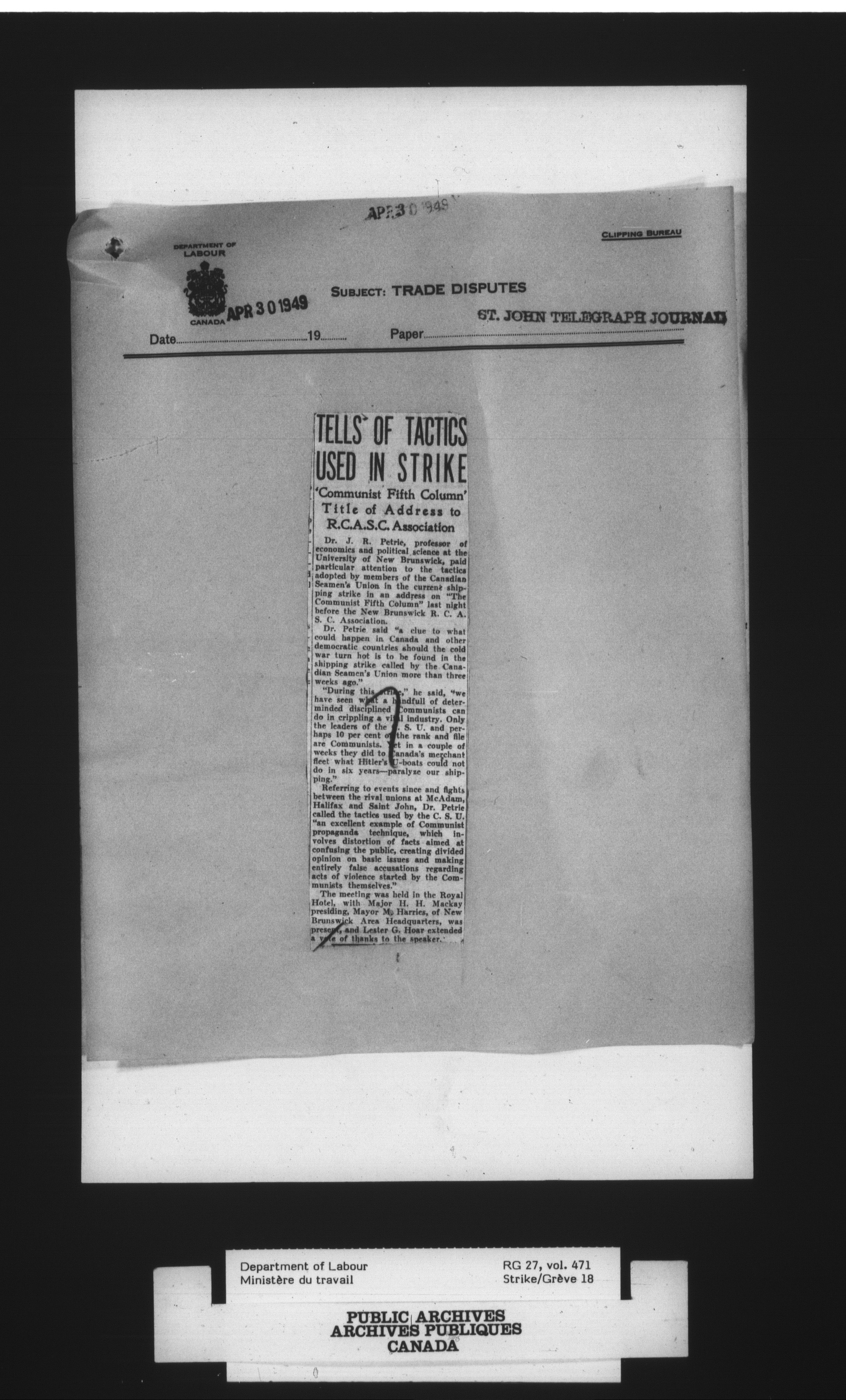 Department of Labour, Economics and Research Branch : Strikes and lockout files - 4099