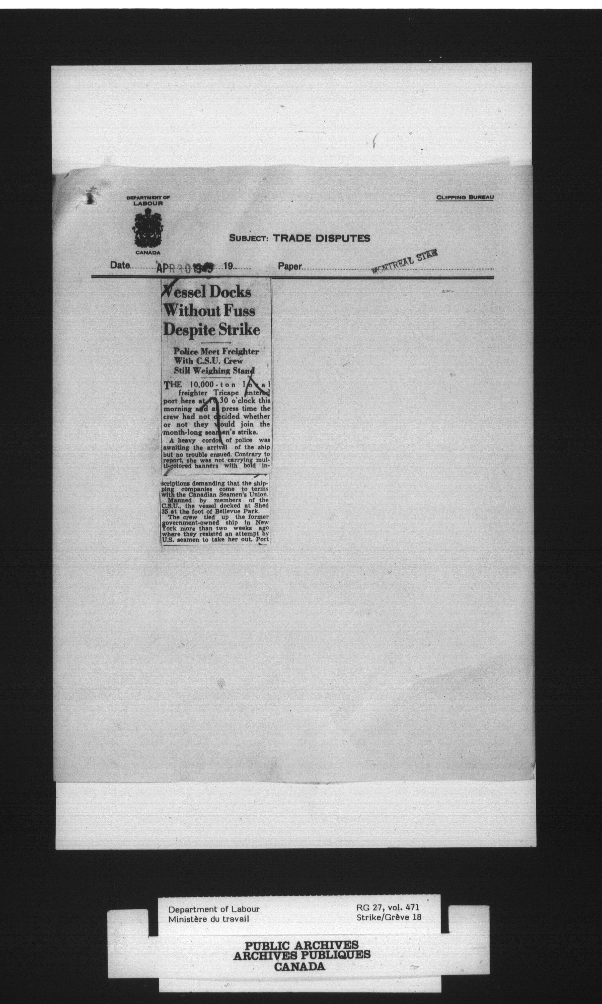 Department of Labour, Economics and Research Branch : Strikes and lockout files - 4099
