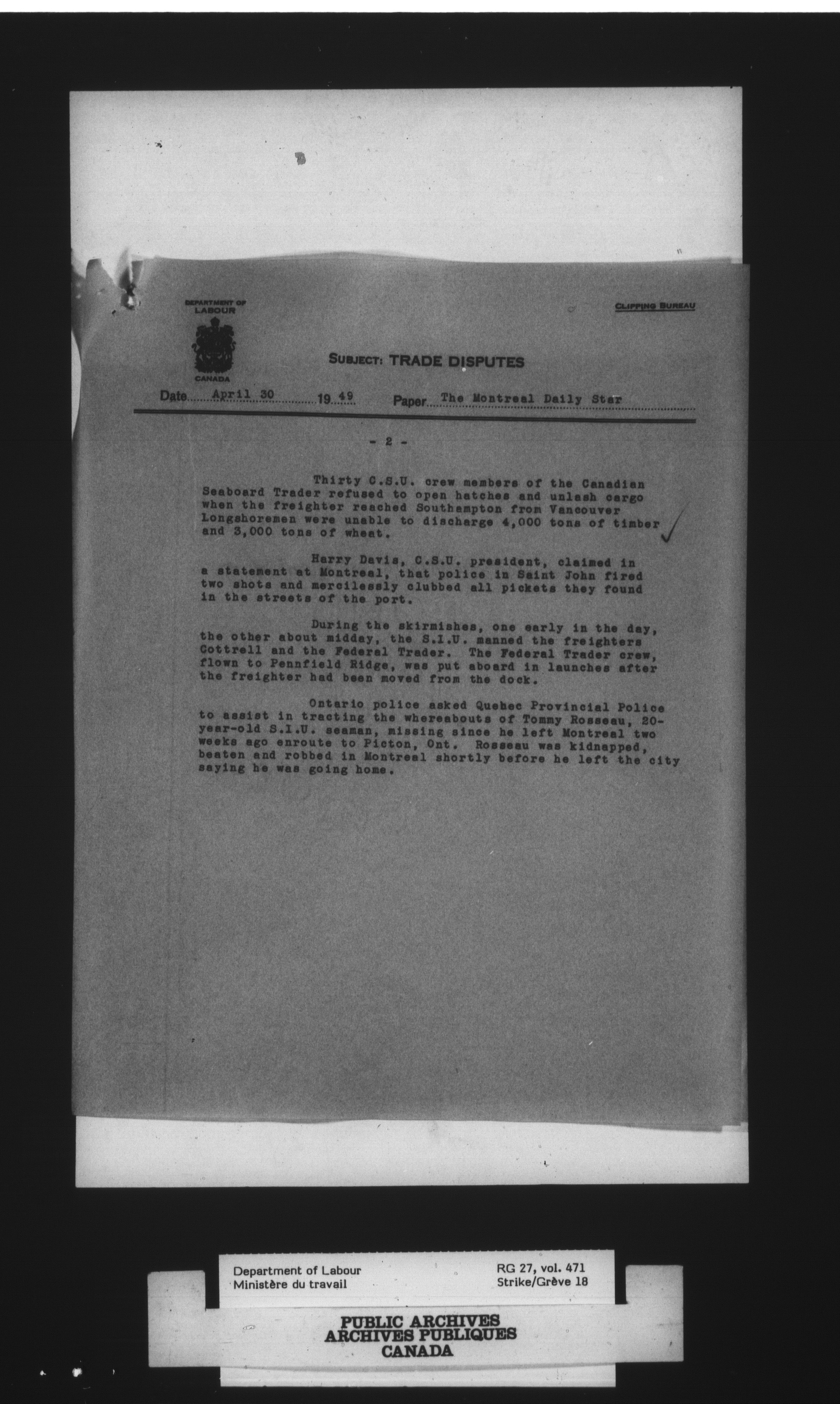 Department of Labour, Economics and Research Branch : Strikes and lockout files - 4099