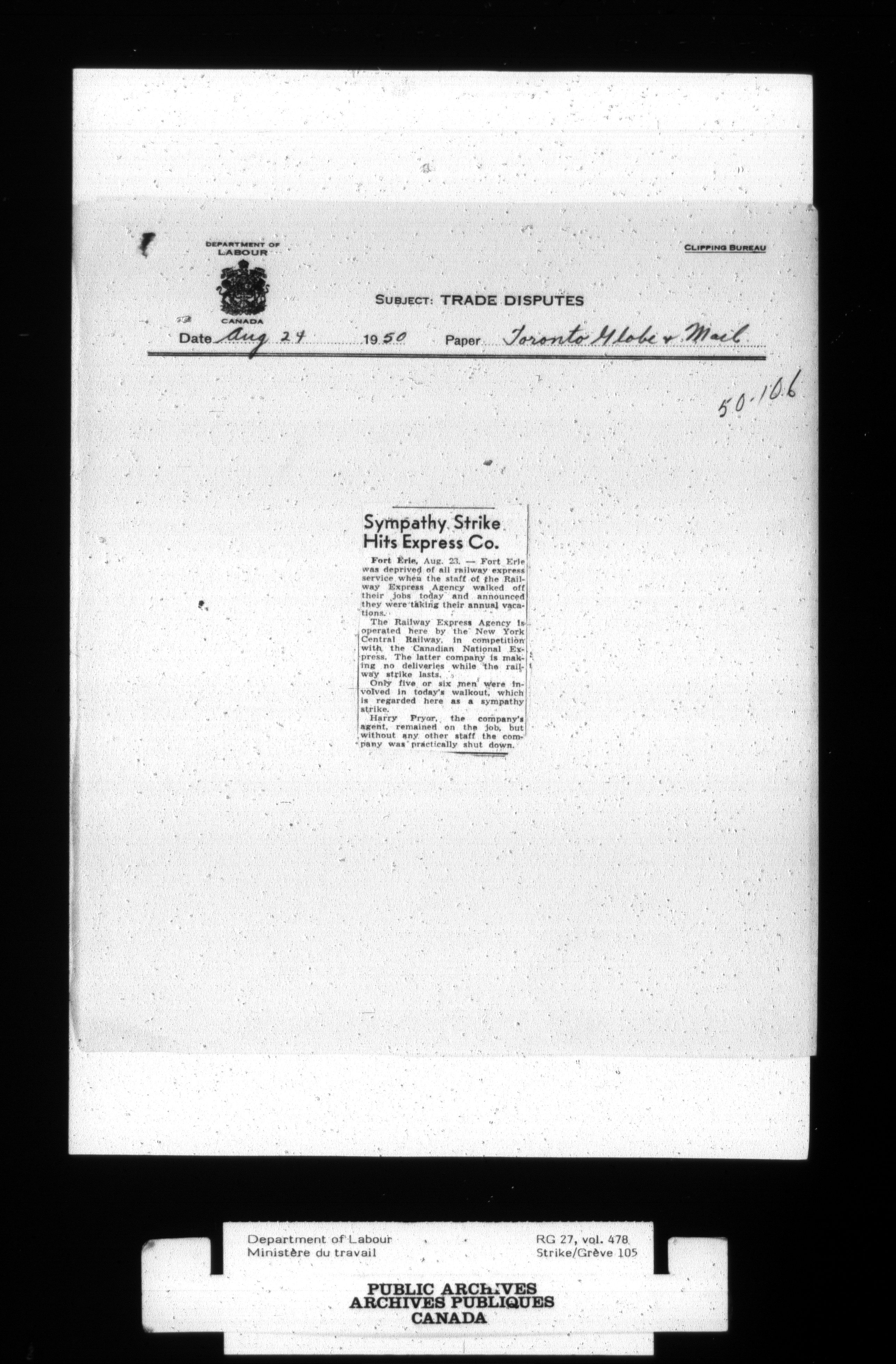 Department of Labour, Economics and Research Branch : Strikes and lockout files : T-4105