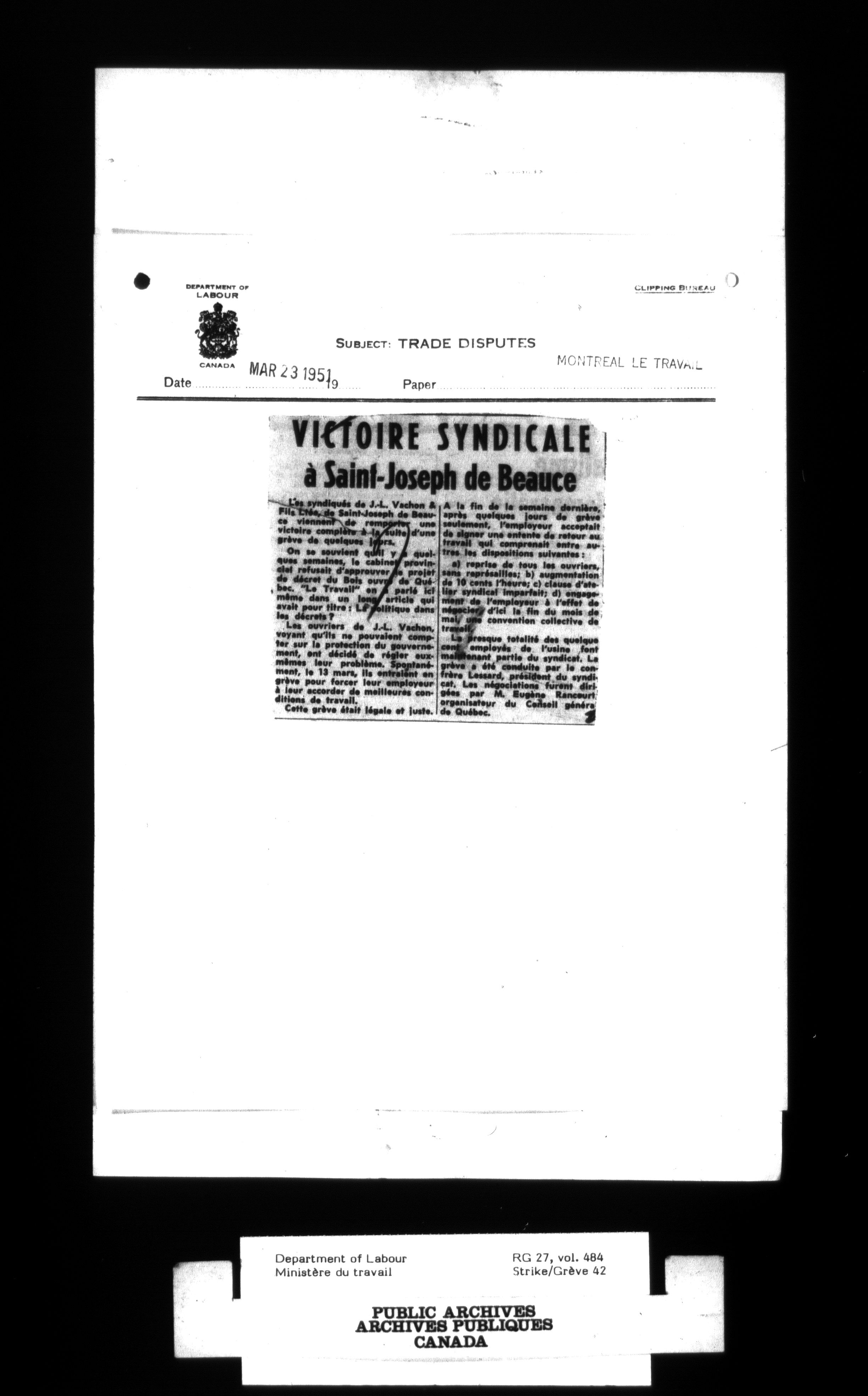 Department of Labour, Economics and Research Branch : Strikes and lockout files : T-4110