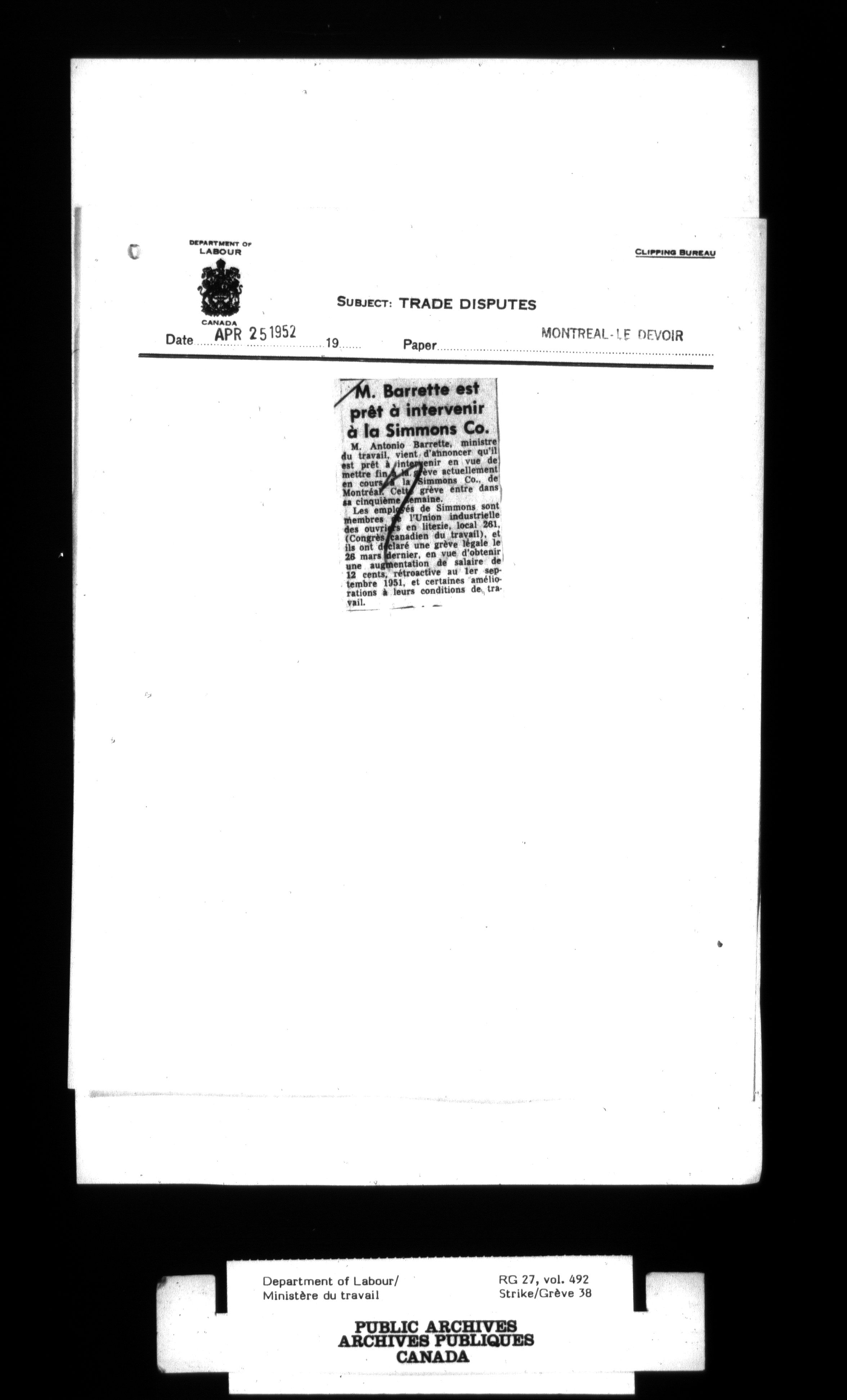 Department of Labour, Economics and Research Branch : Strikes and lockout files : T-4116