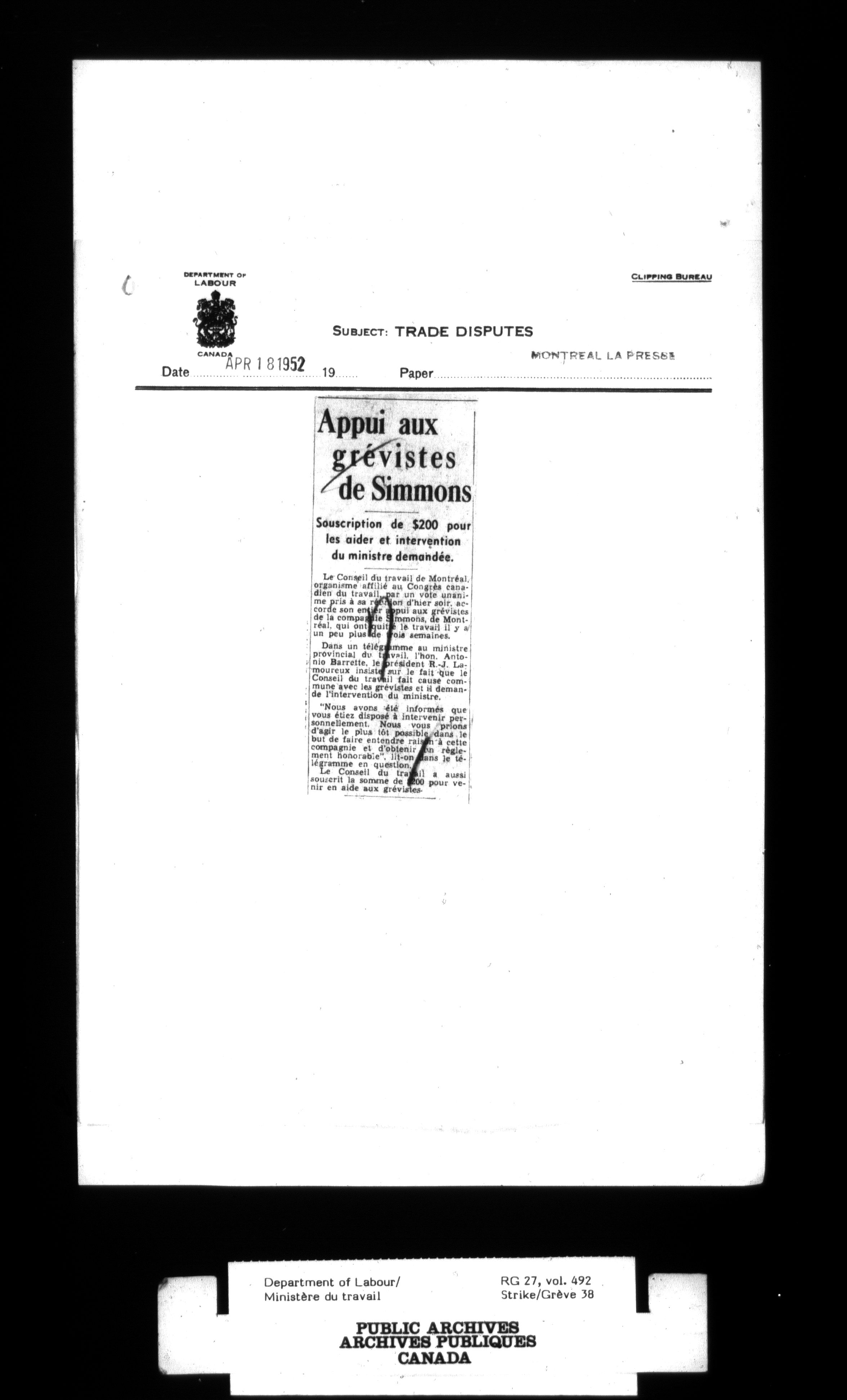Department of Labour, Economics and Research Branch : Strikes and lockout files - 4116