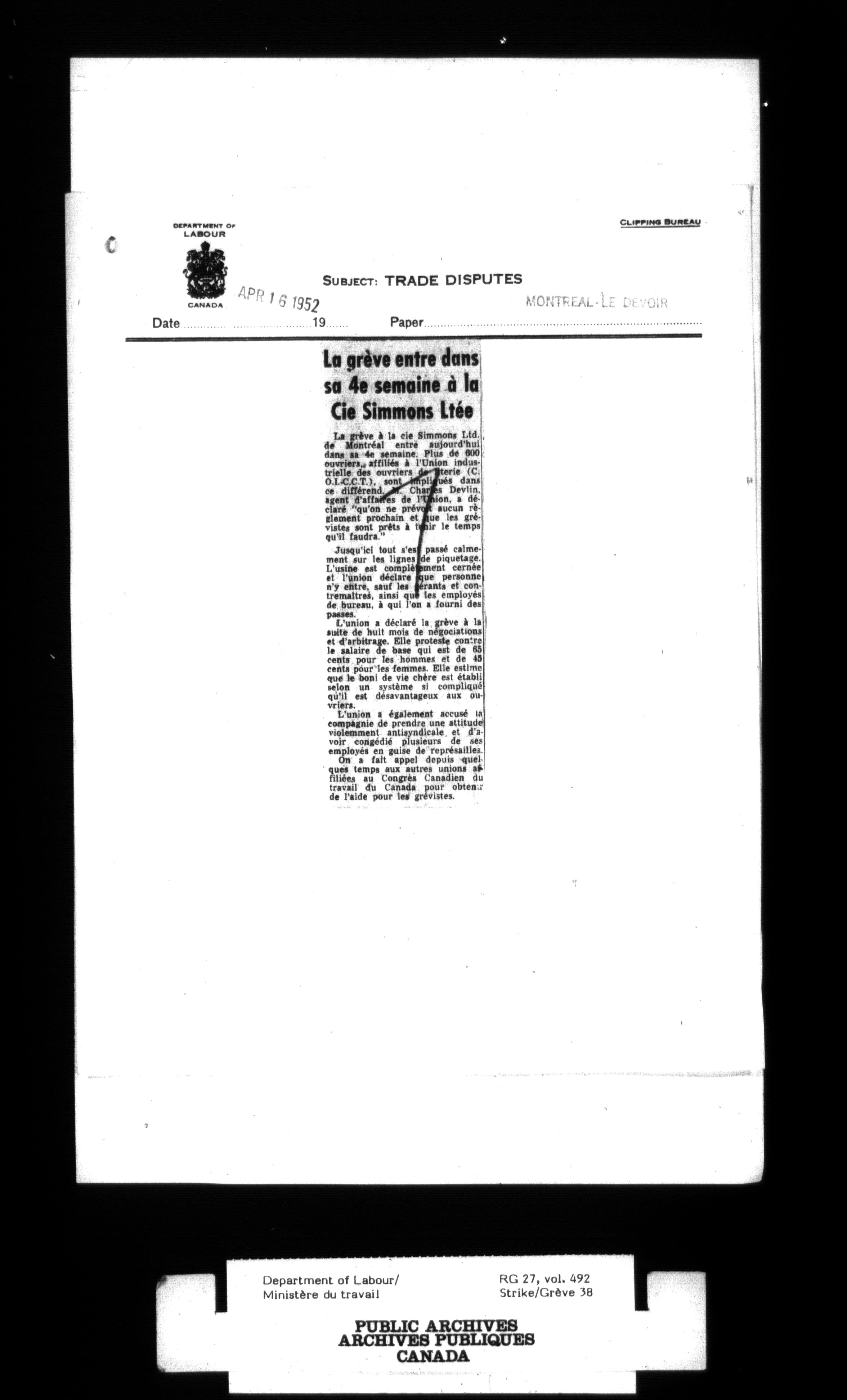 Department of Labour, Economics and Research Branch : Strikes and lockout files - 4116
