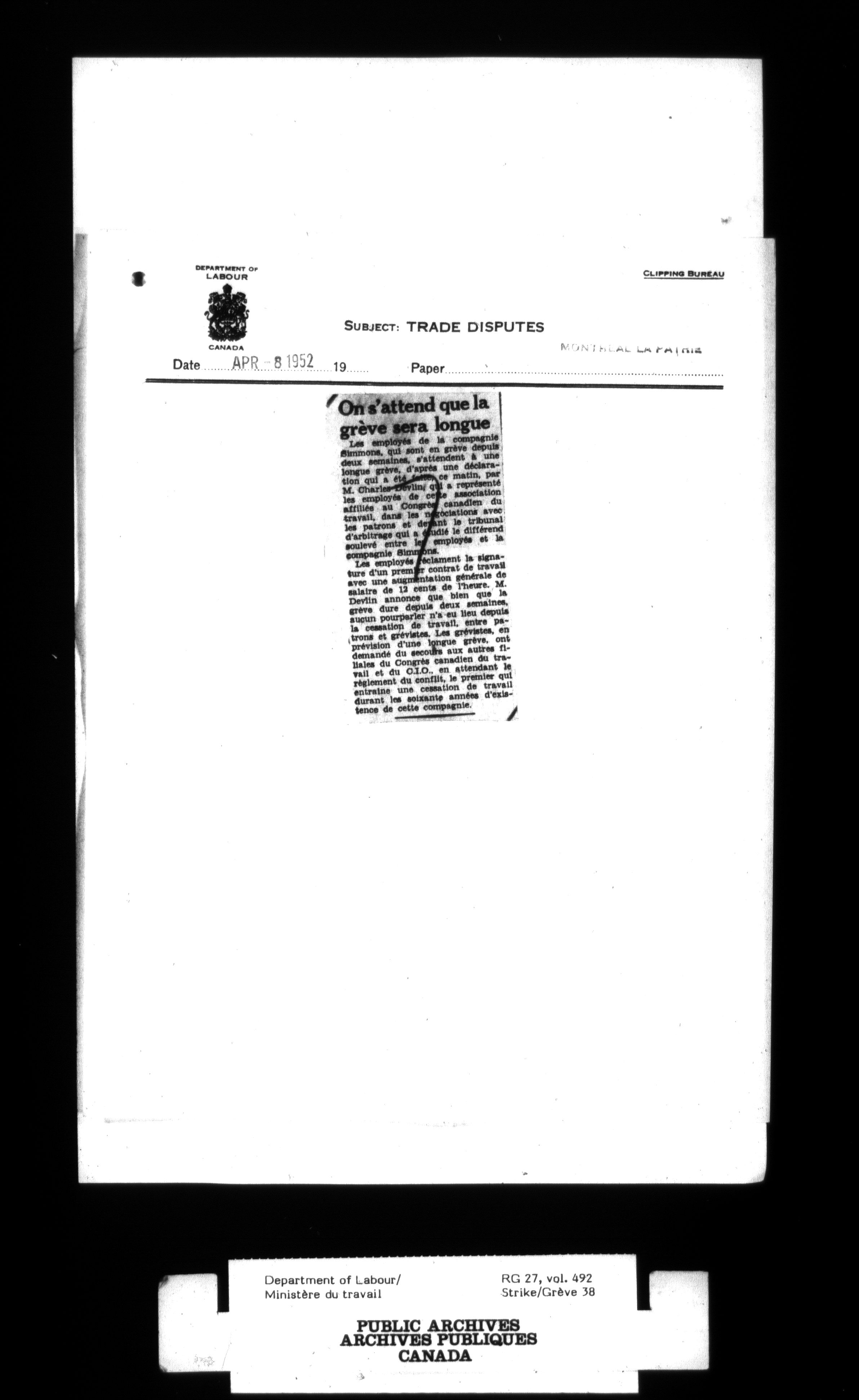 Department of Labour, Economics and Research Branch : Strikes and lockout files : T-4116