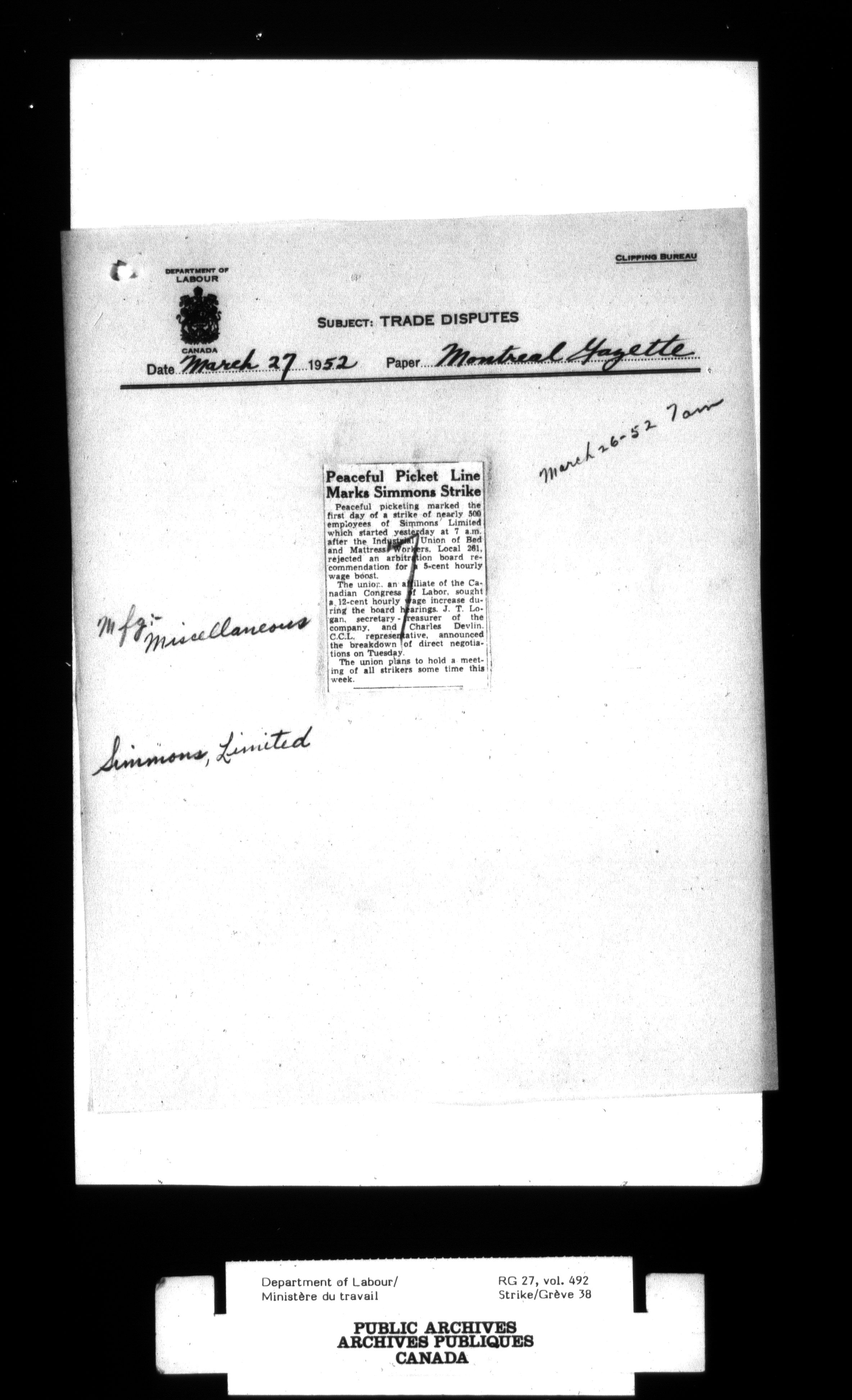 Department of Labour, Economics and Research Branch : Strikes and lockout files - 4116