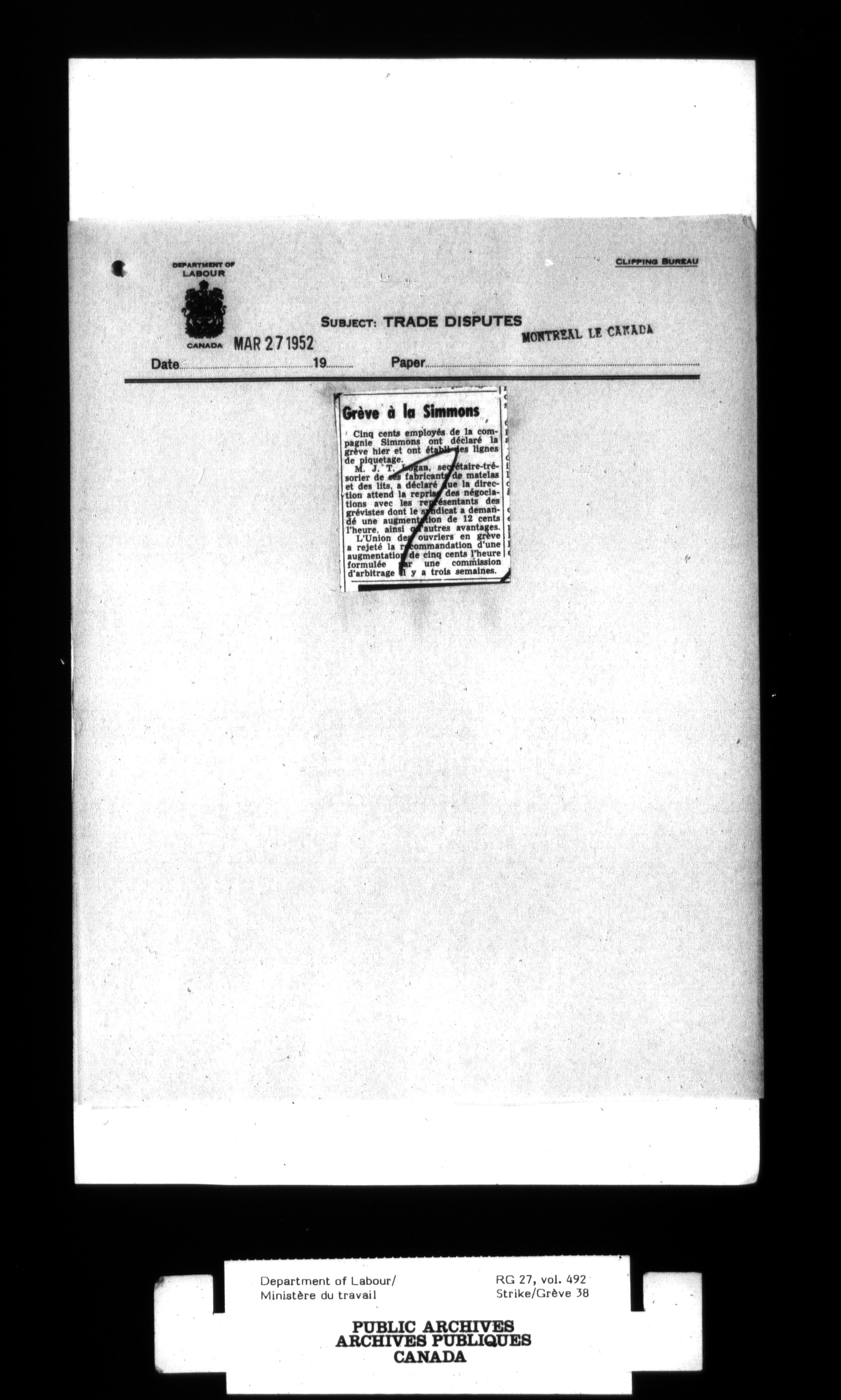 Department of Labour, Economics and Research Branch : Strikes and lockout files : T-4116