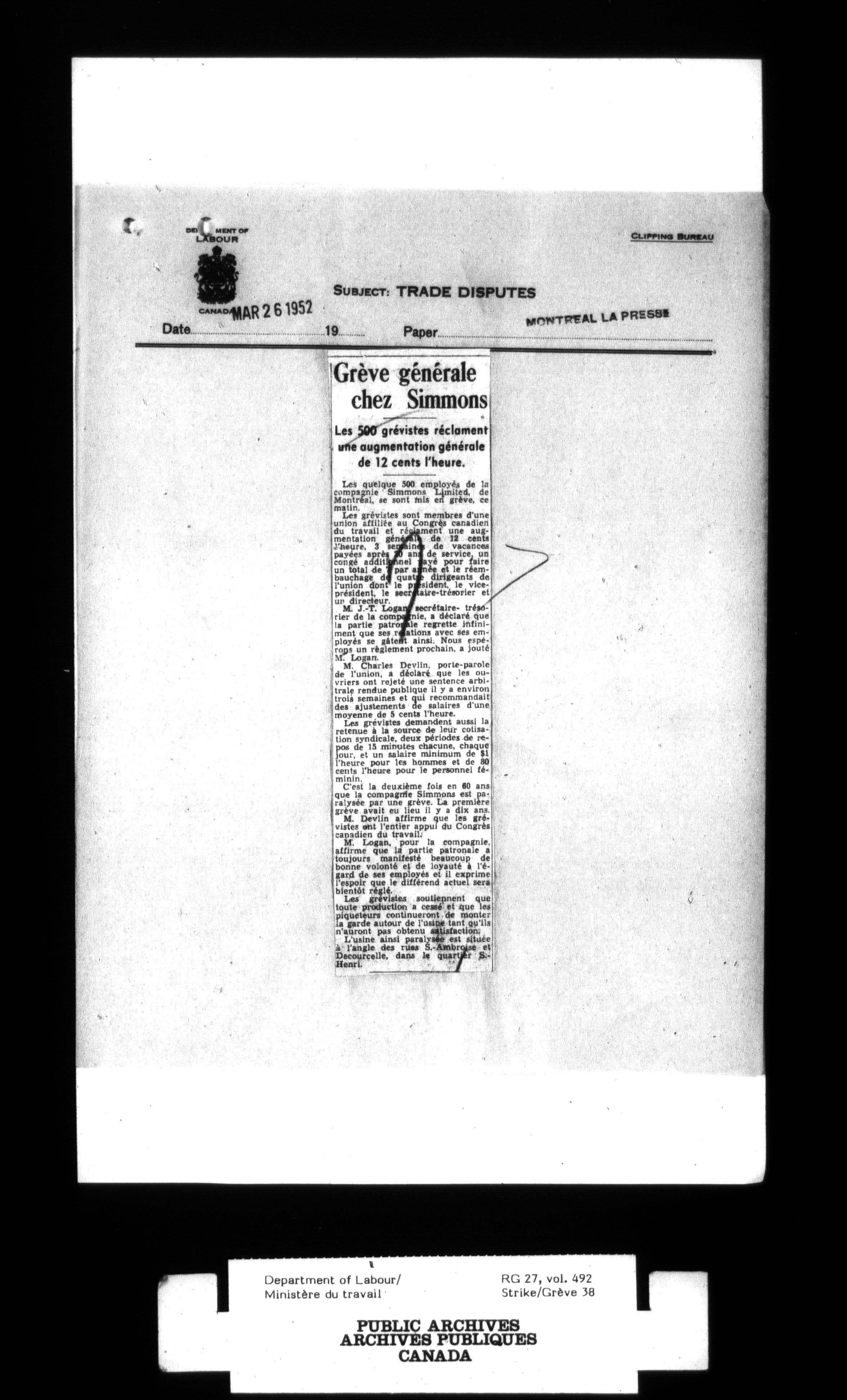Department of Labour, Economics and Research Branch : Strikes and lockout files : T-4116