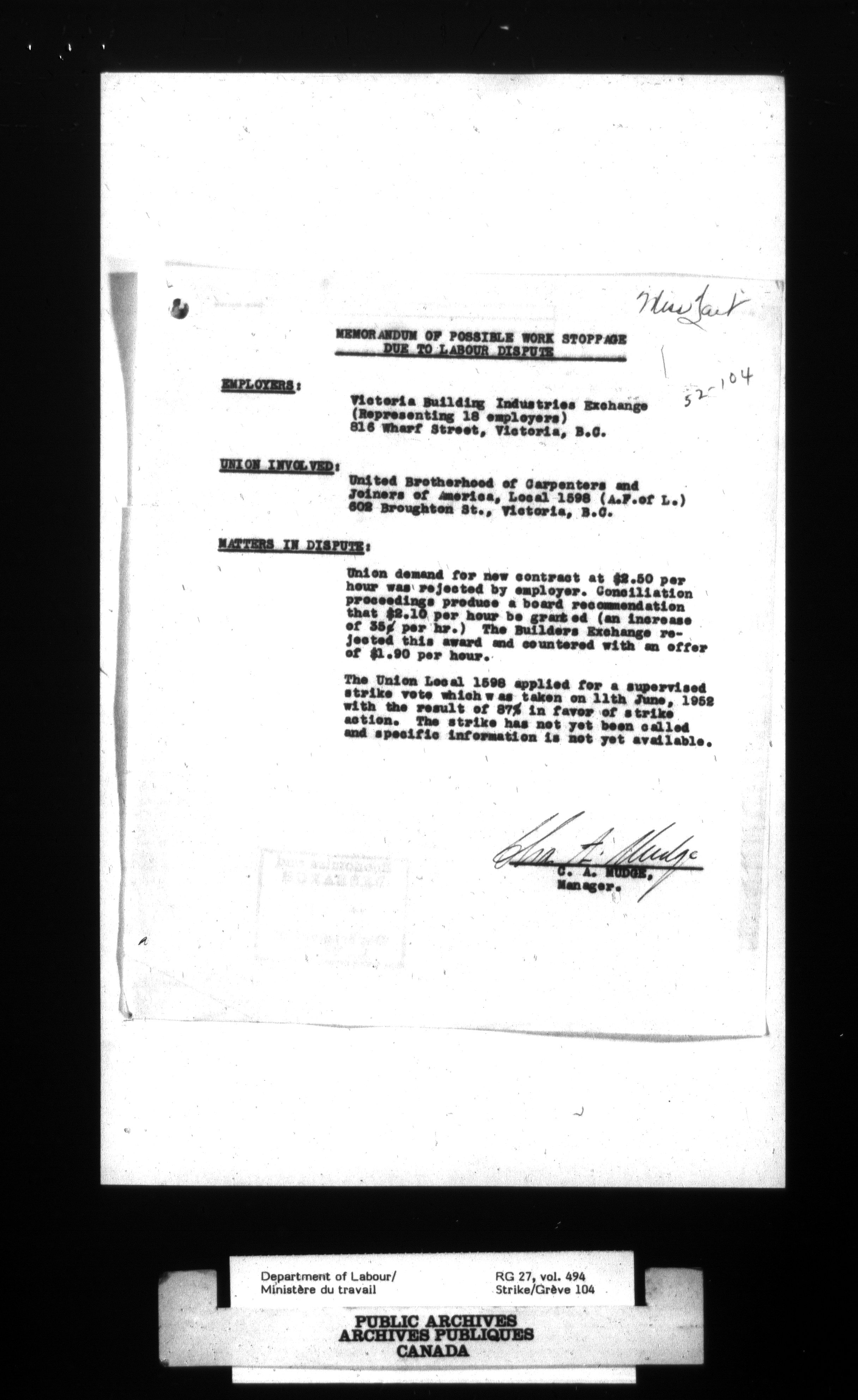 Department of Labour, Economics and Research Branch : Strikes and lockout files - 4118