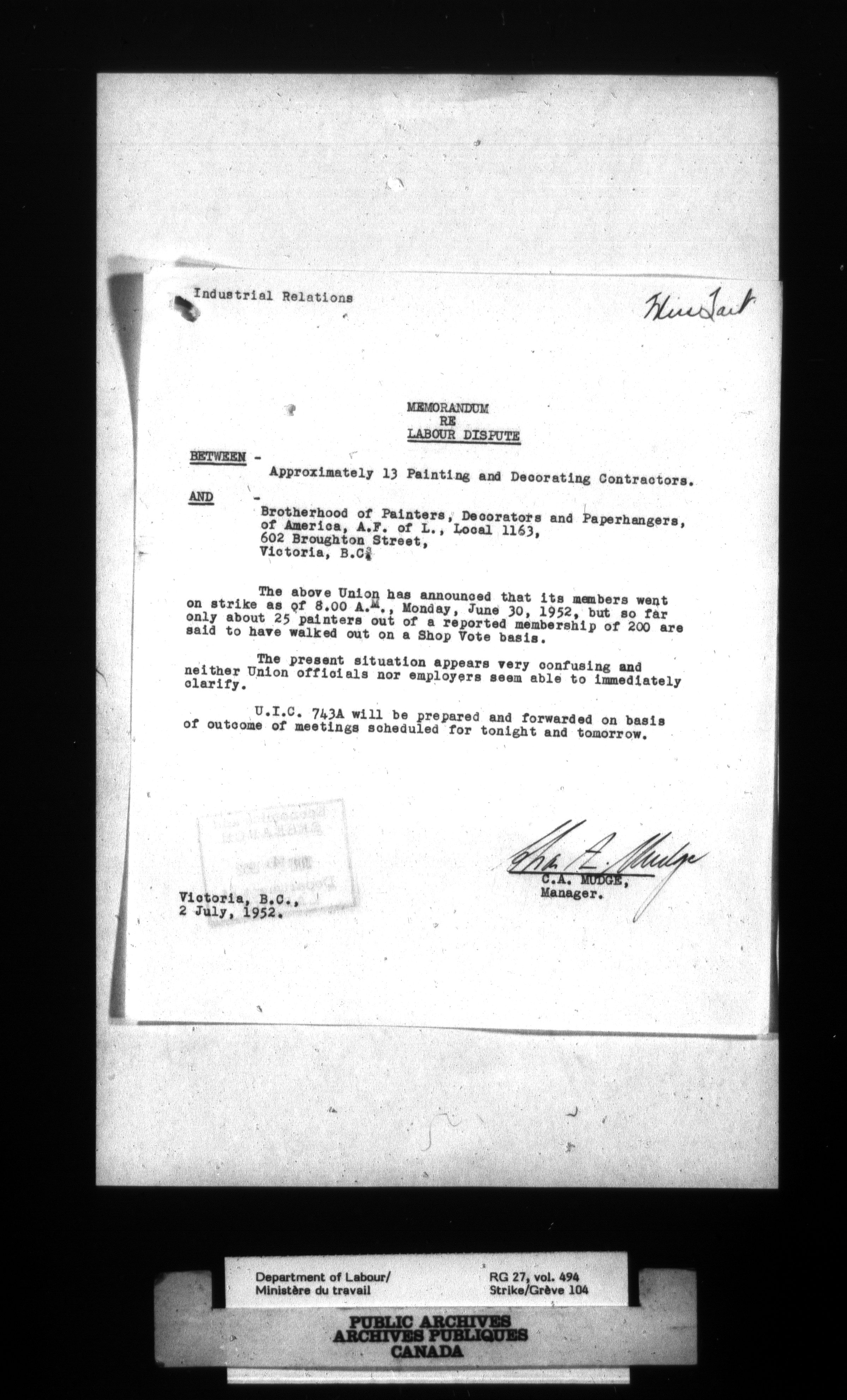 Department of Labour, Economics and Research Branch : Strikes and lockout files : T-4118
