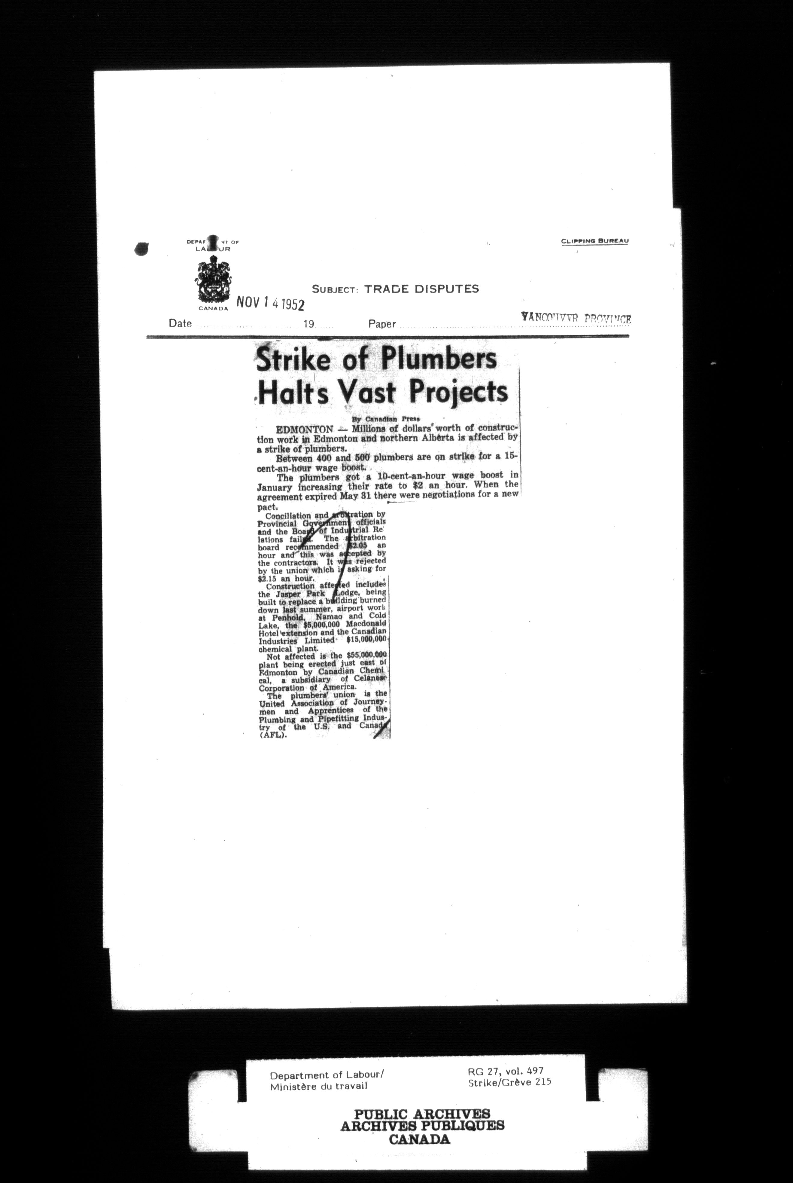 Department of Labour, Economics and Research Branch : Strikes and lockout files : T-4122