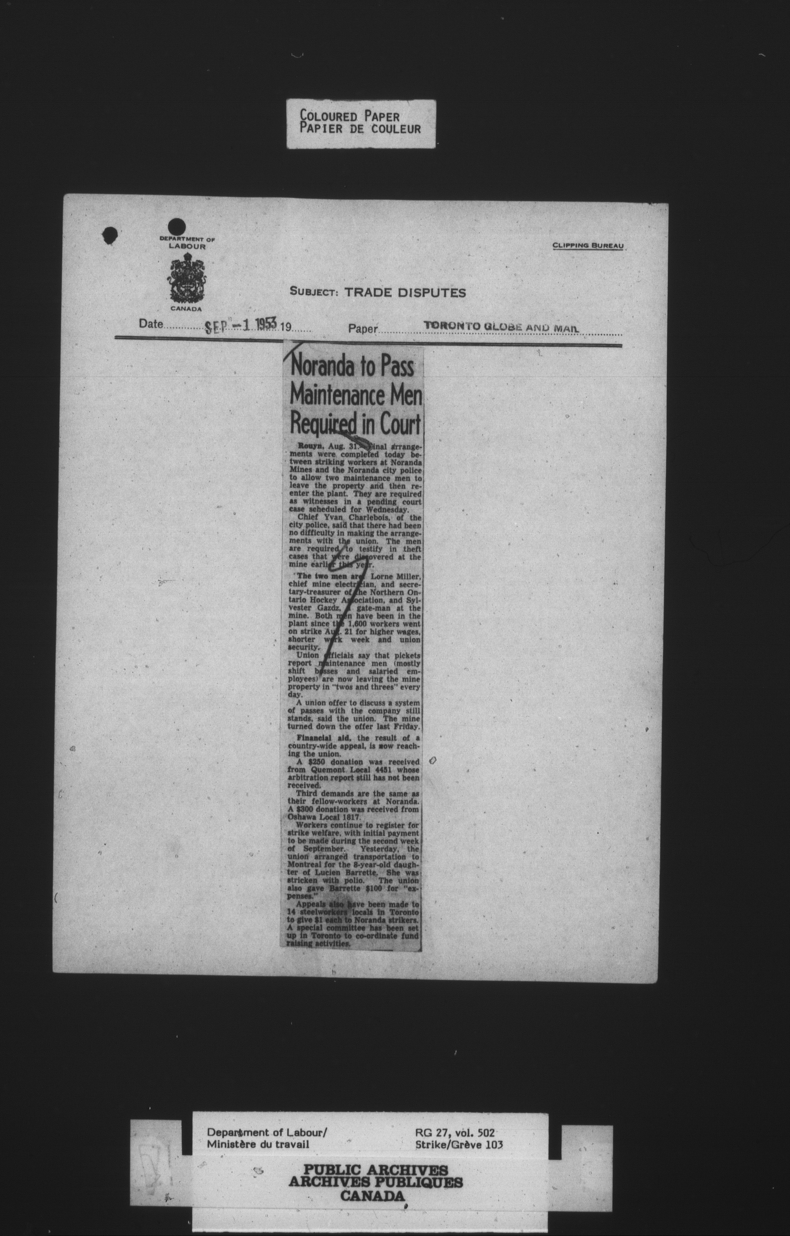 Department of Labour, Economics and Research Branch : Strikes and lockout files - 4125