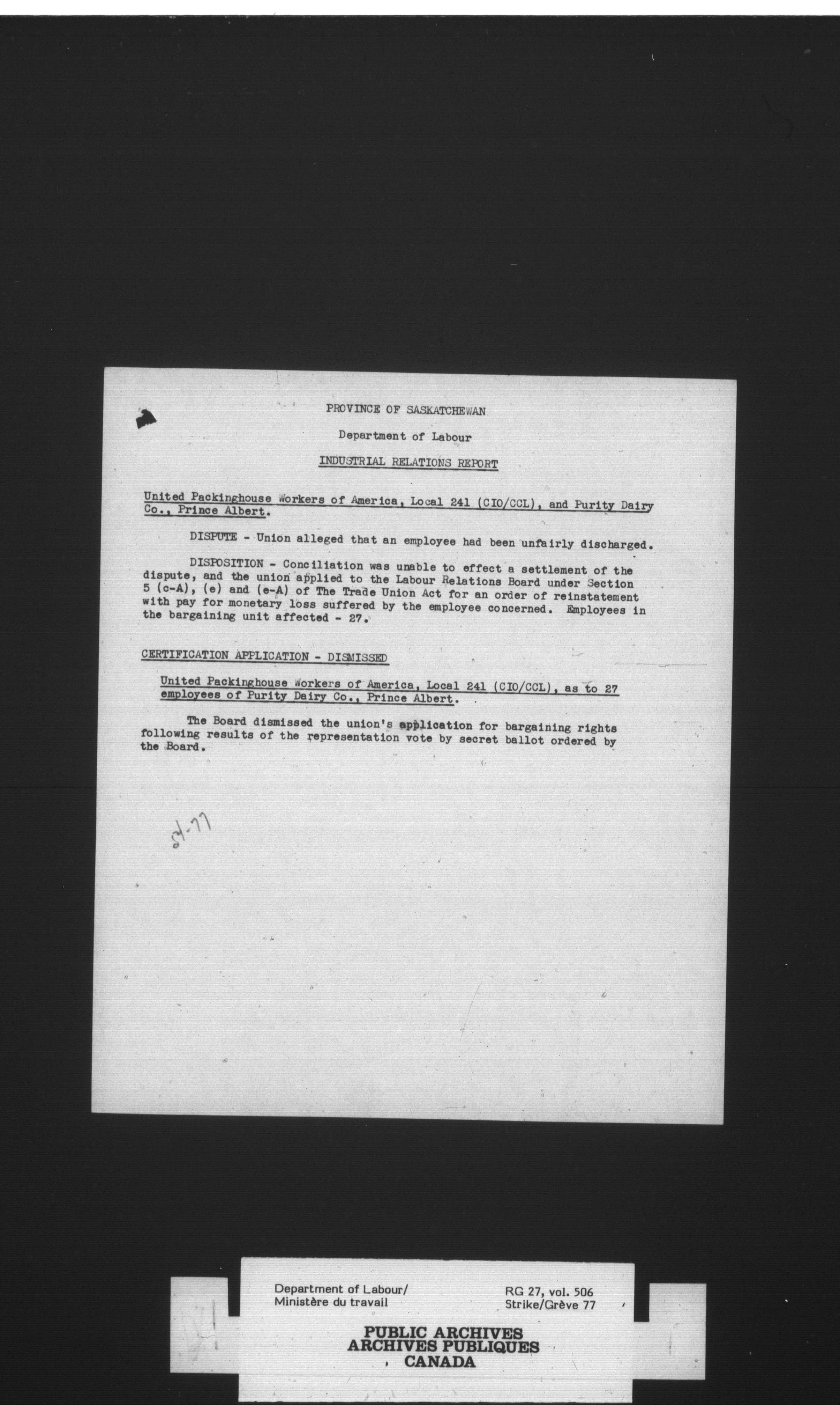 Department of Labour, Economics and Research Branch : Strikes and lockout files - 4128