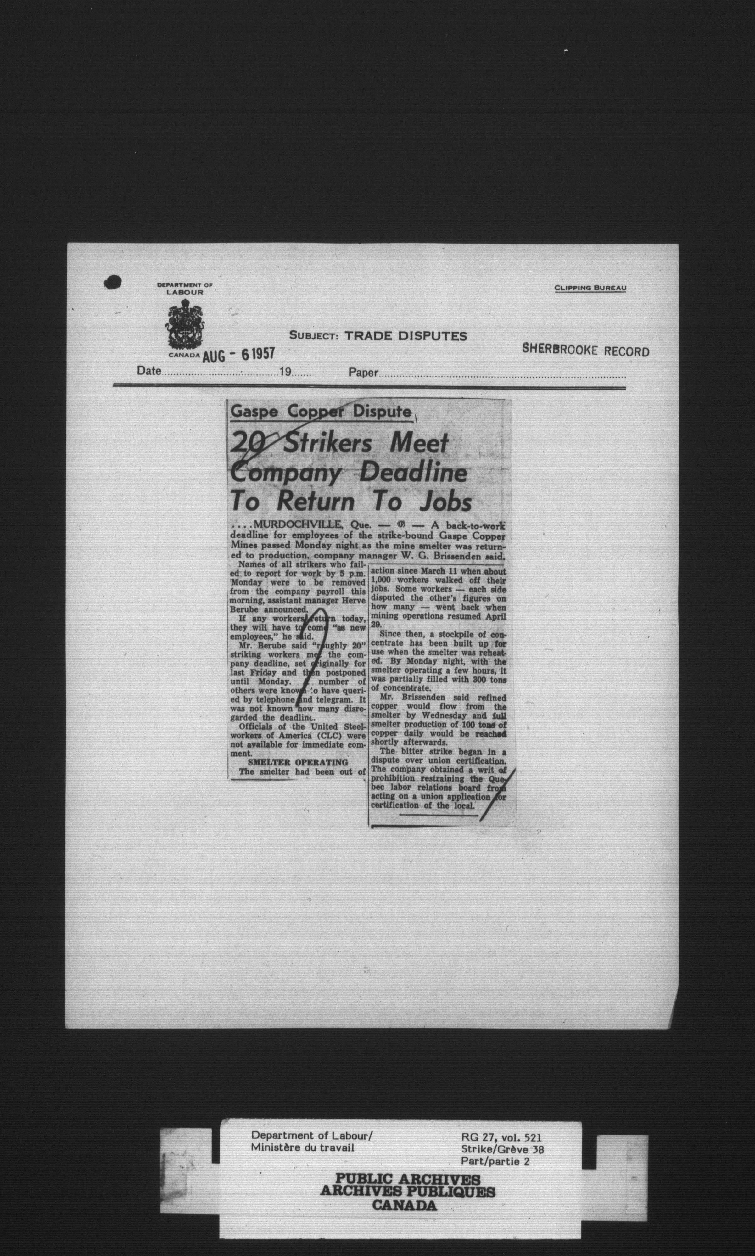 Department of Labour, Economics and Research Branch : Strikes and lockout files - 4137