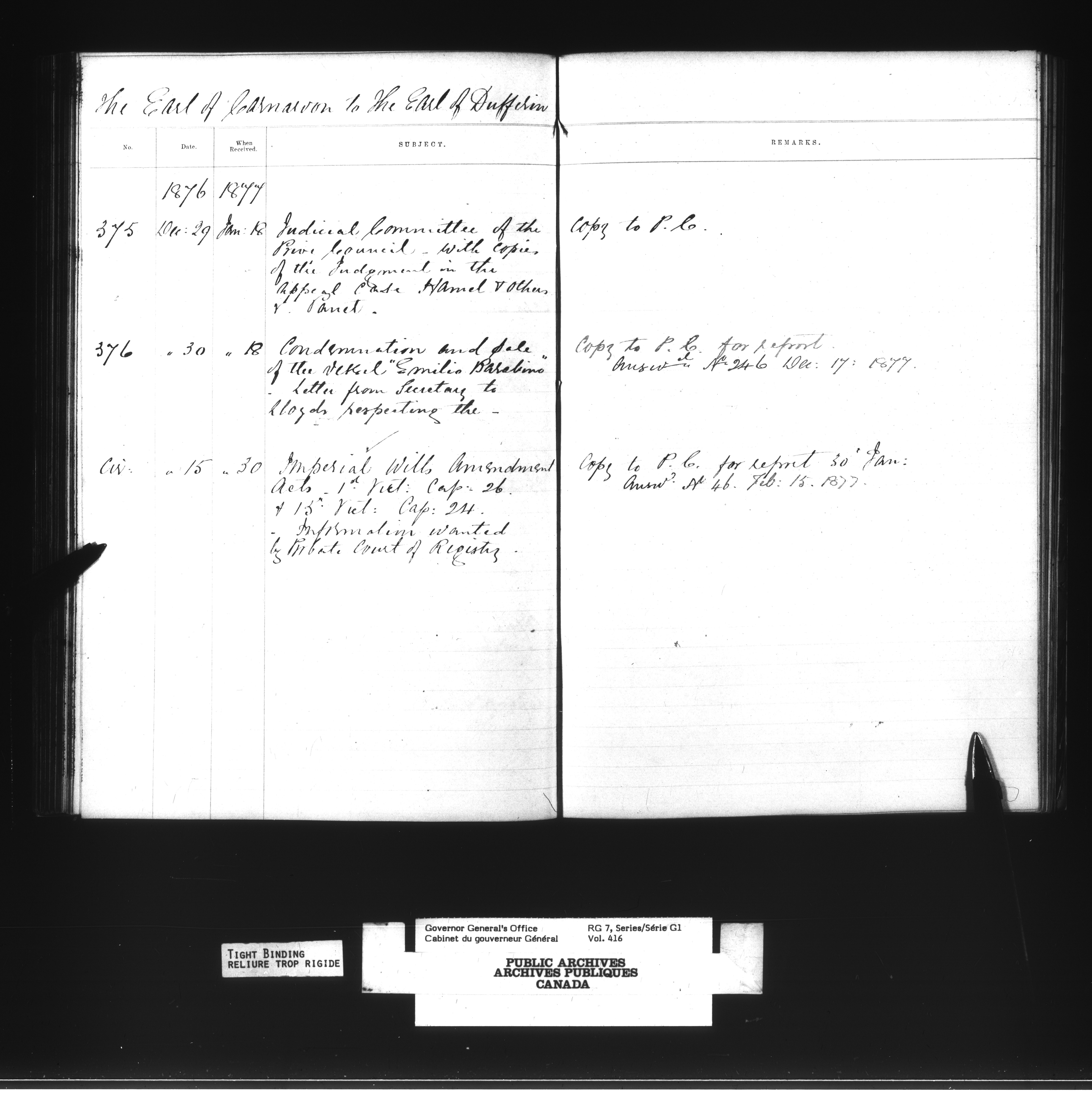 Governor General's Office Register of Despatches between the Colonial Office and the Governor General, 1867-1877 (Indexes) - 4164