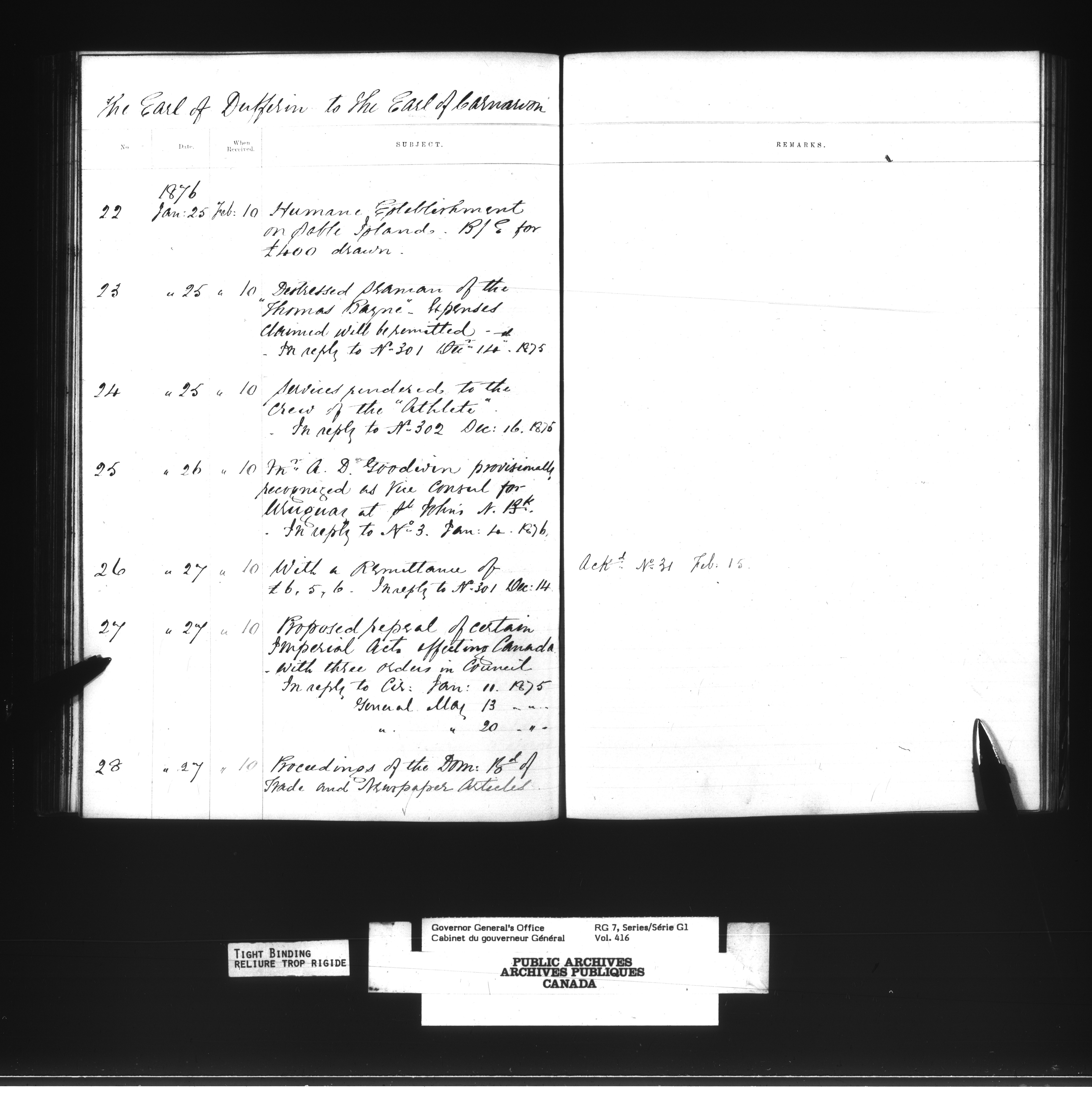 Governor General's Office Register of Despatches between the Colonial Office and the Governor General, 1867-1877 (Indexes) - 4164