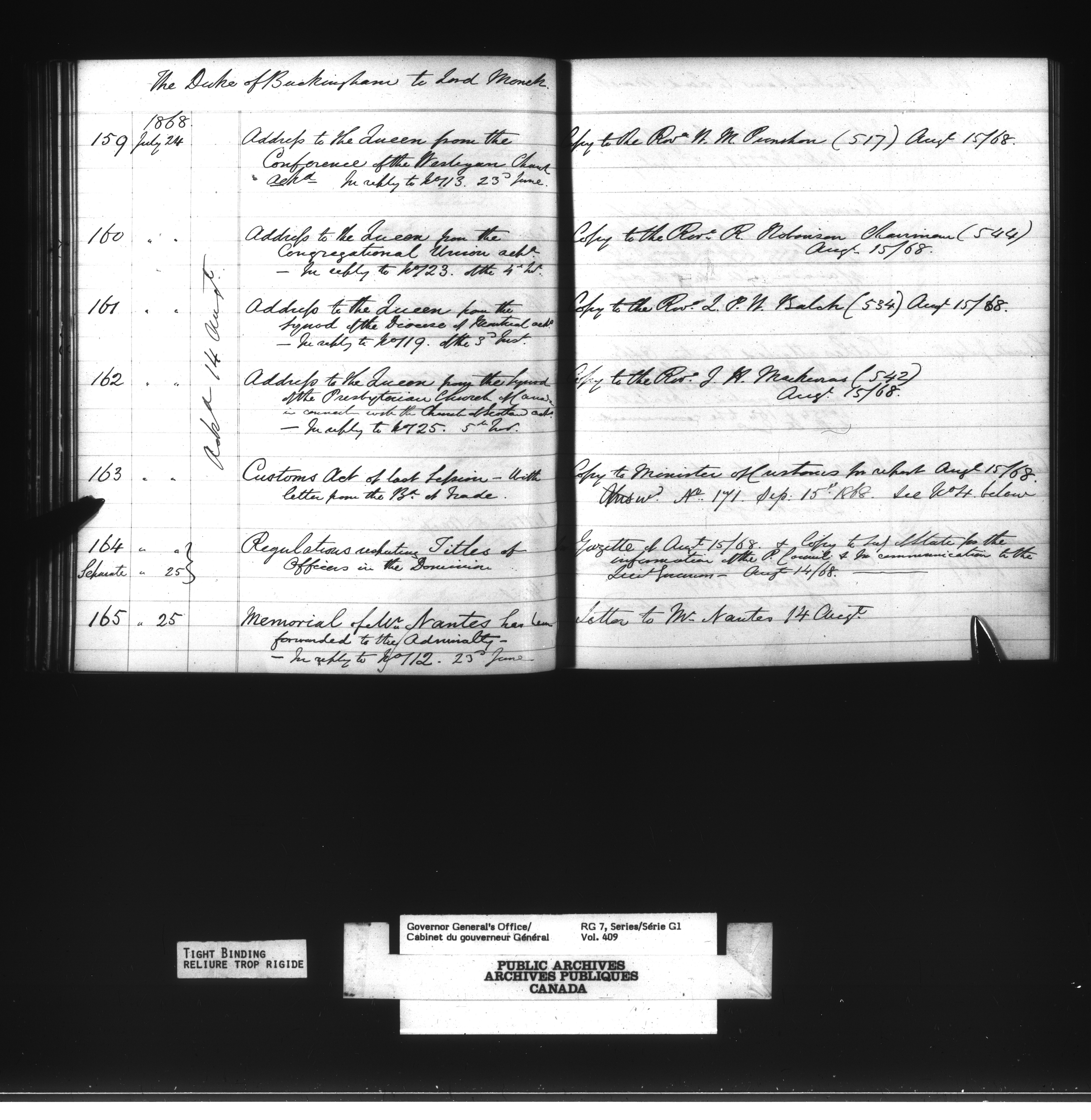 Governor General's Office Register of Despatches between the Colonial Office and the Governor General, 1867-1877 (Indexes) - 4164