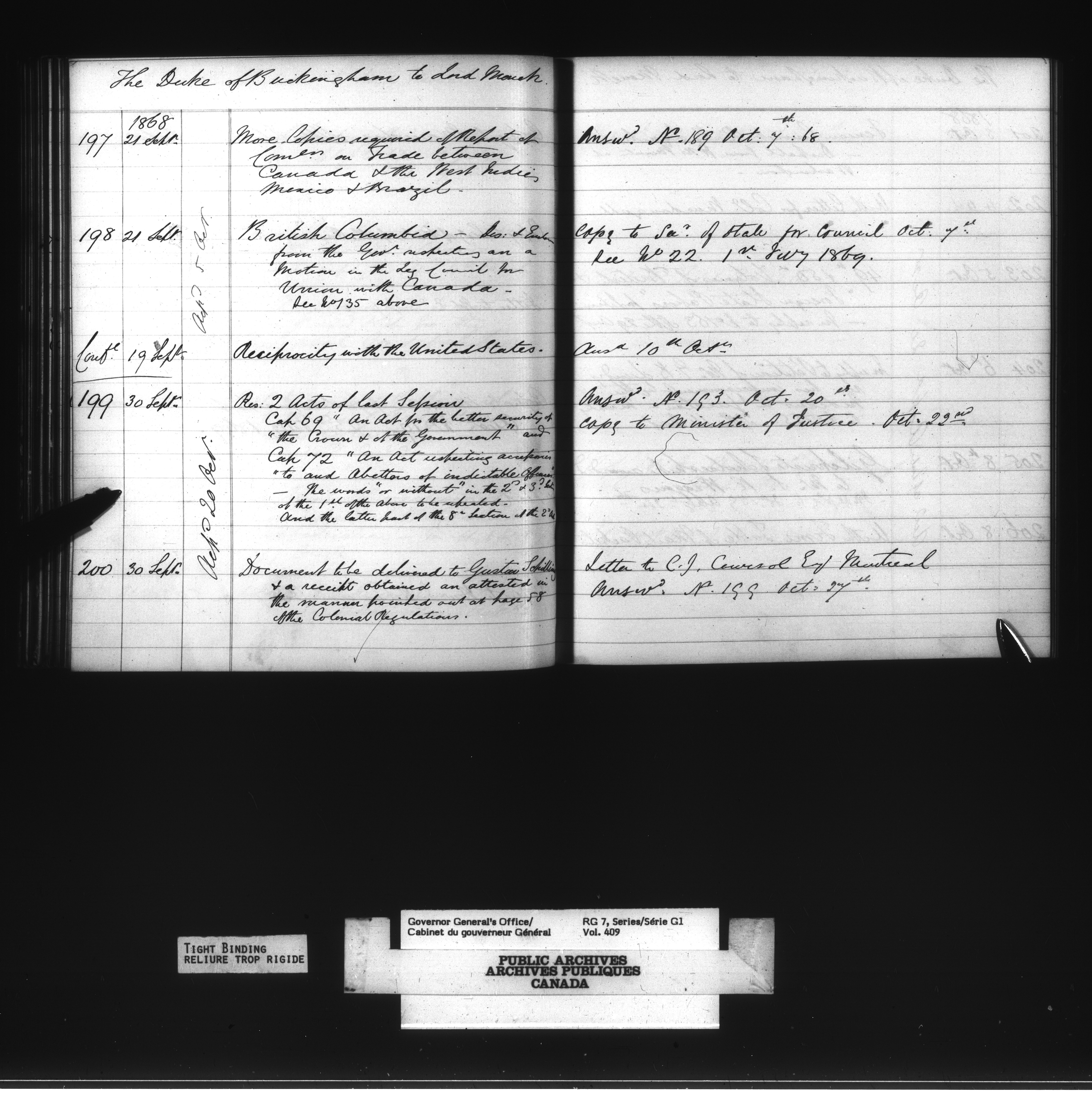 Governor General's Office Register of Despatches between the Colonial Office and the Governor General, 1867-1877 (Indexes) - 4164