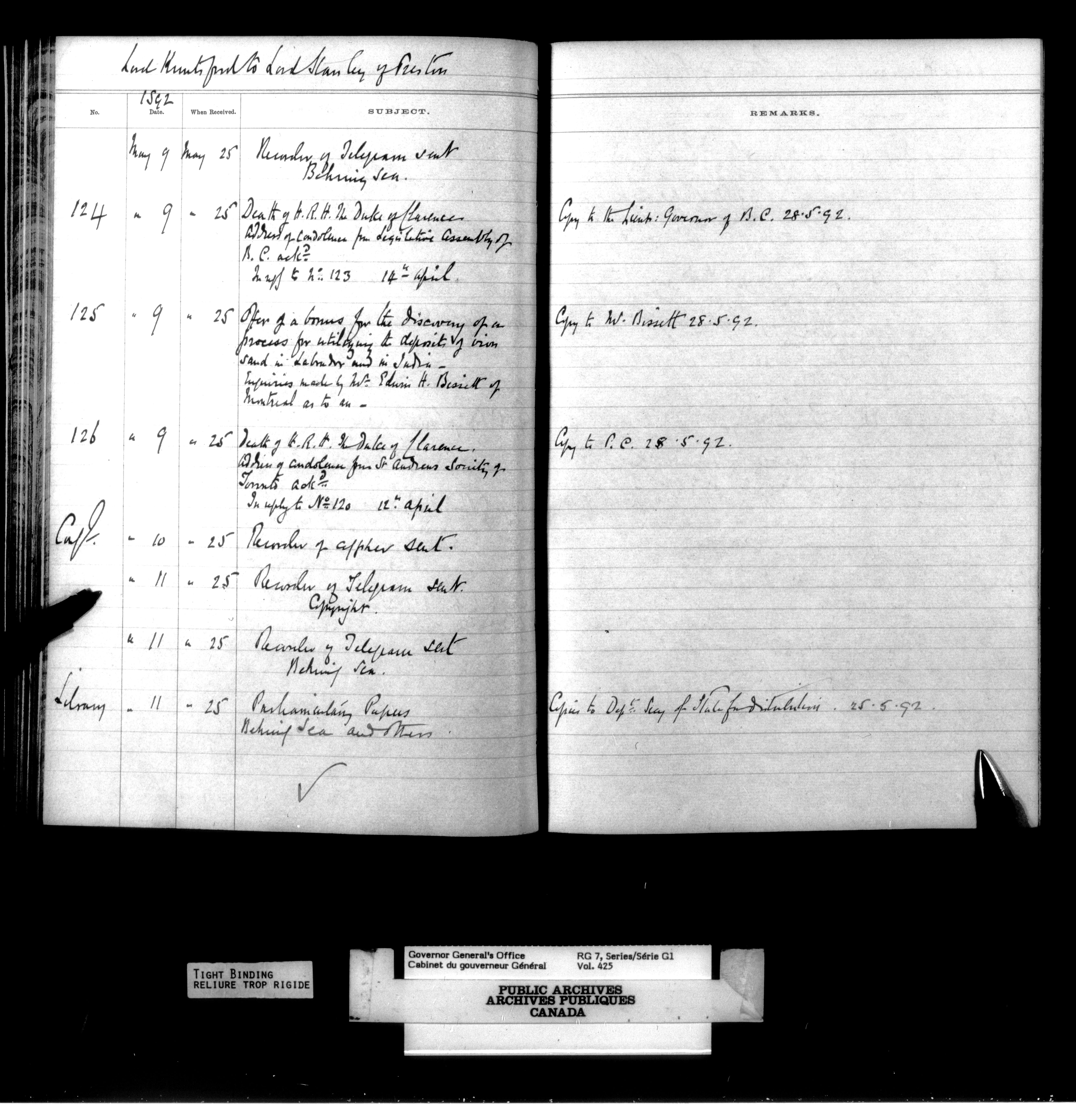 Governor General's Office Register of Despatches between the Colonial Office and the Governor General, 1885-1893 (Indexes) - 4166