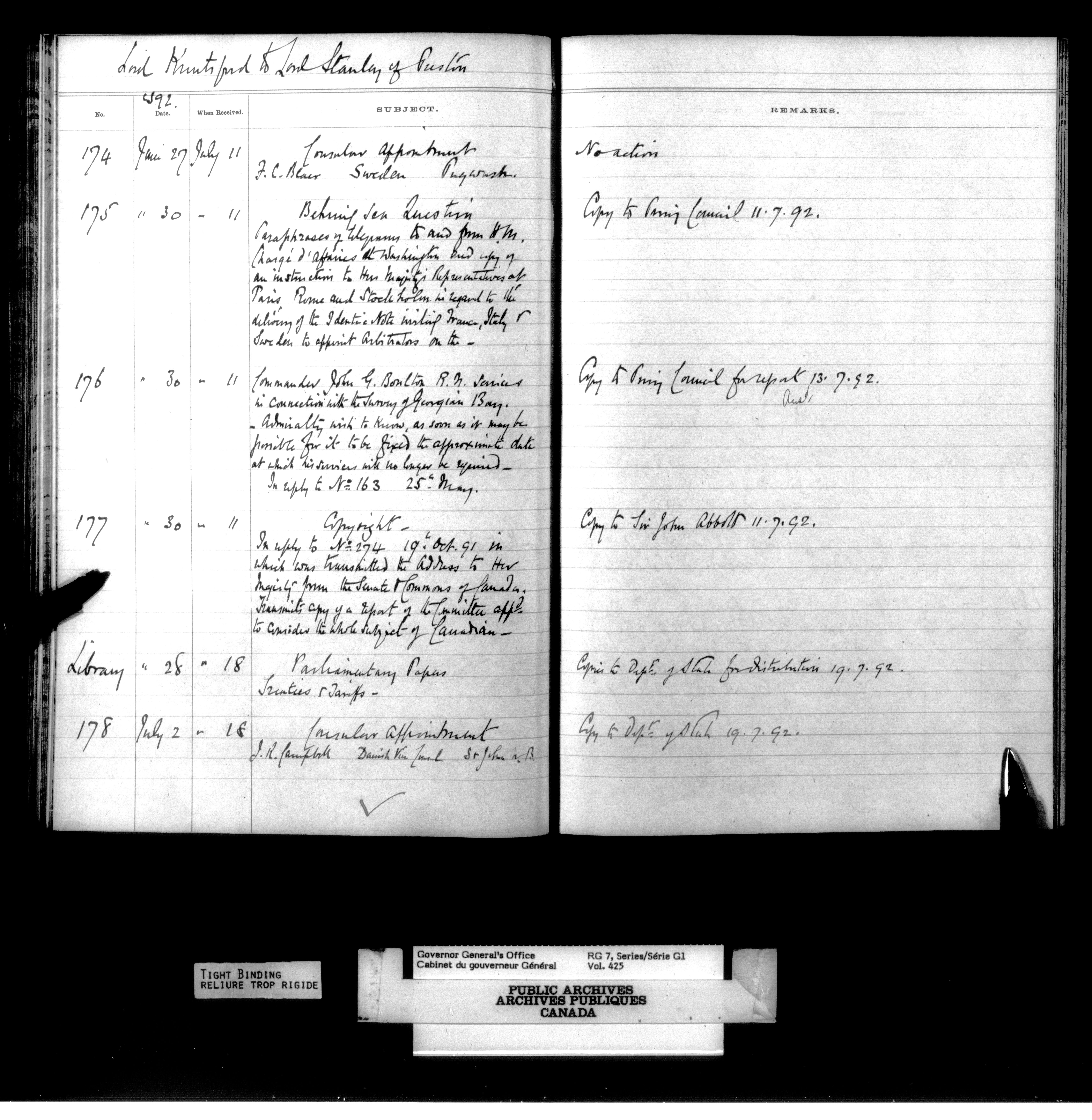 Governor General's Office Register of Despatches between the Colonial Office and the Governor General, 1885-1893 (Indexes) - 4166