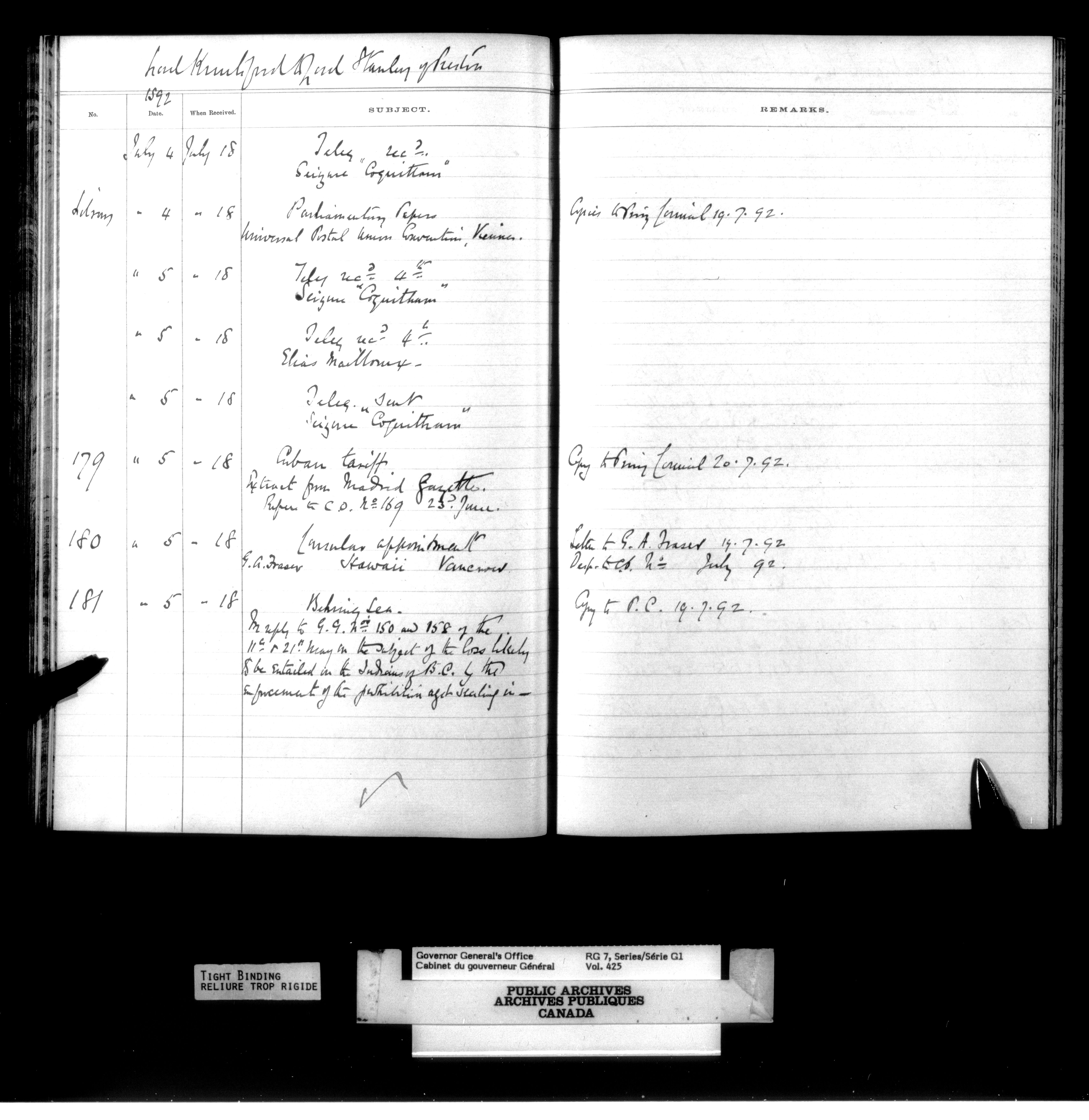 Governor General's Office Register of Despatches between the Colonial Office and the Governor General, 1885-1893 (Indexes) - 4166