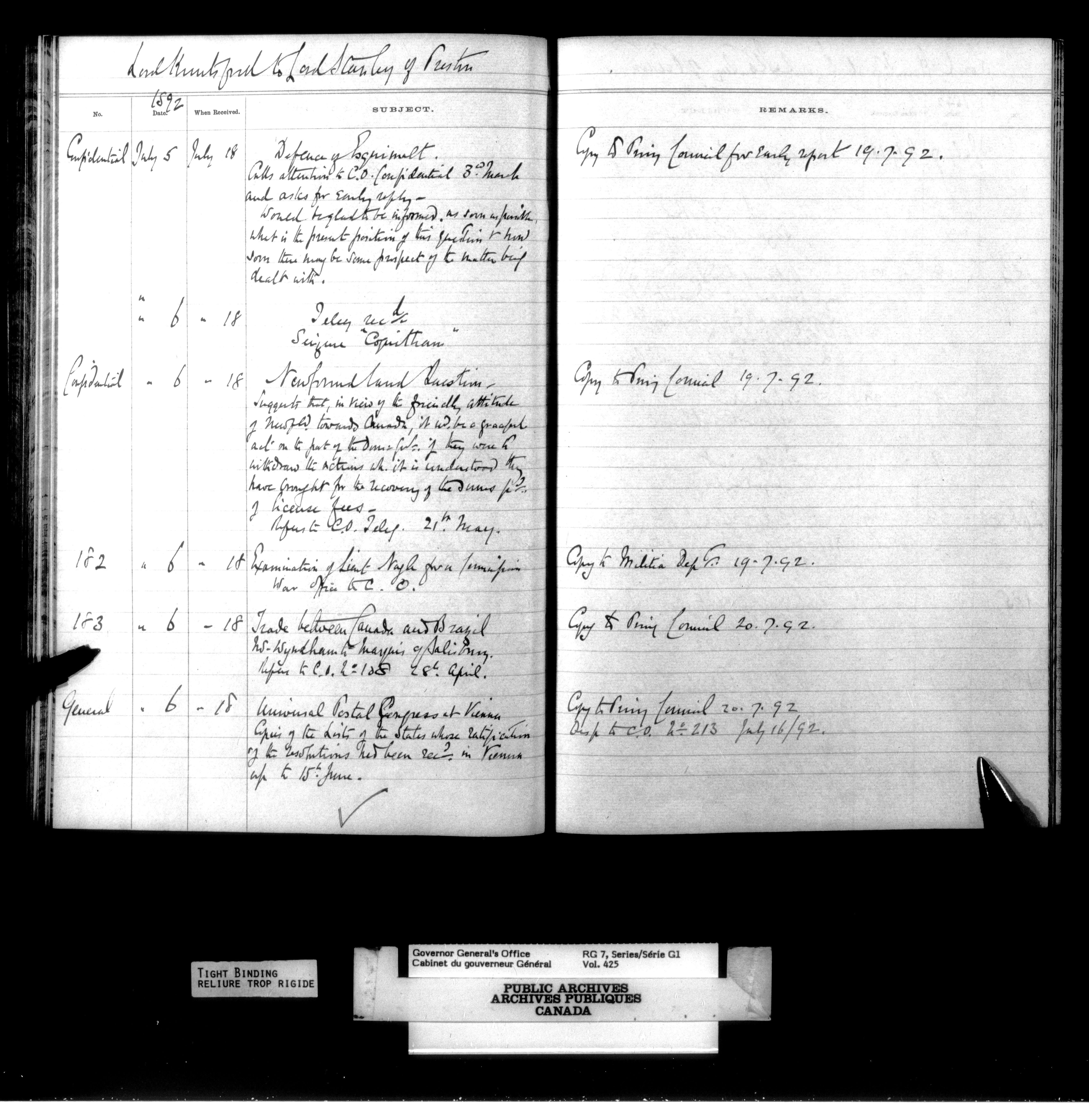 Governor General's Office Register of Despatches between the Colonial Office and the Governor General, 1885-1893 (Indexes) - 4166