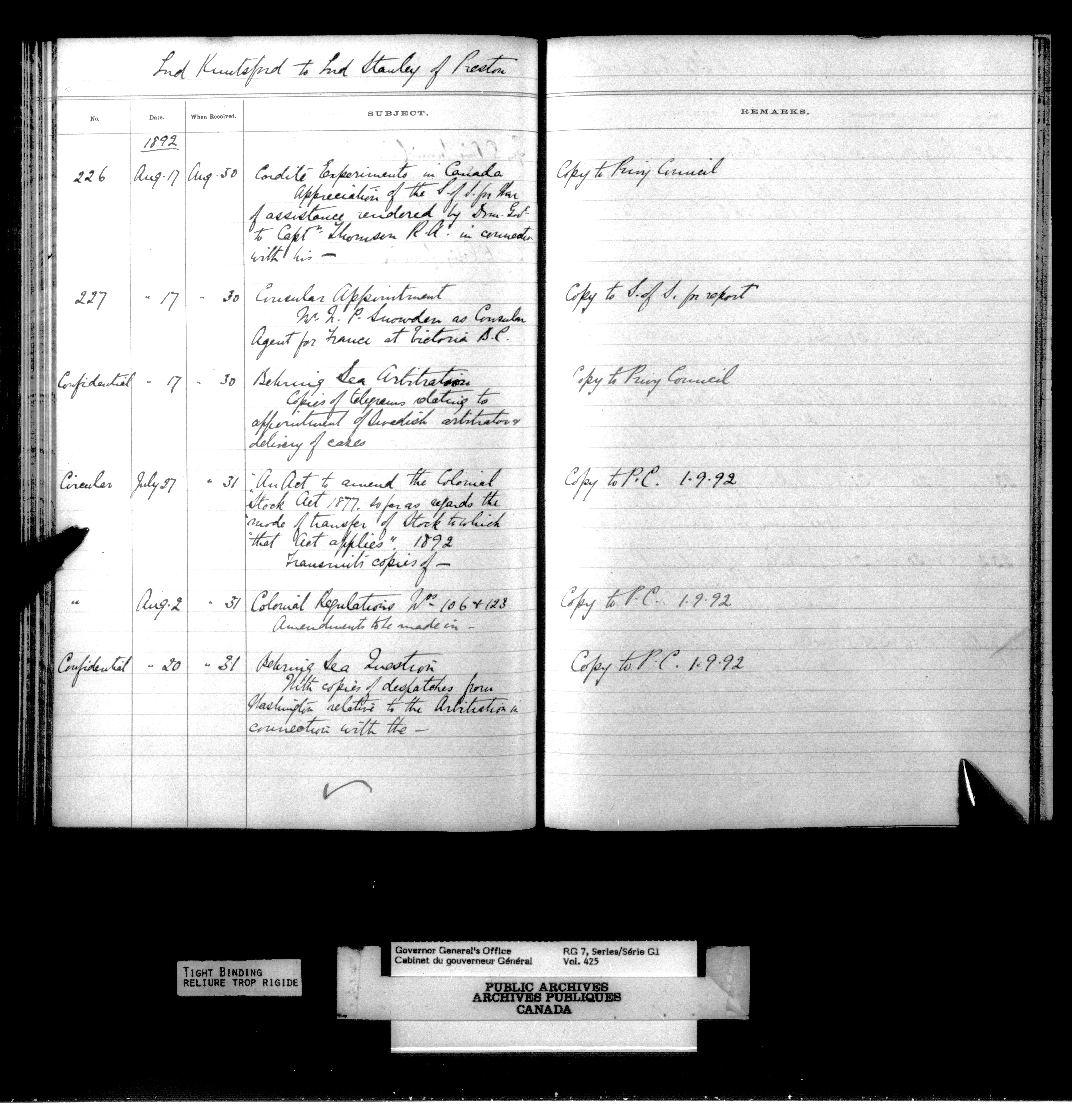 Governor General's Office Register of Despatches between the Colonial Office and the Governor General, 1885-1893 (Indexes) - 4166