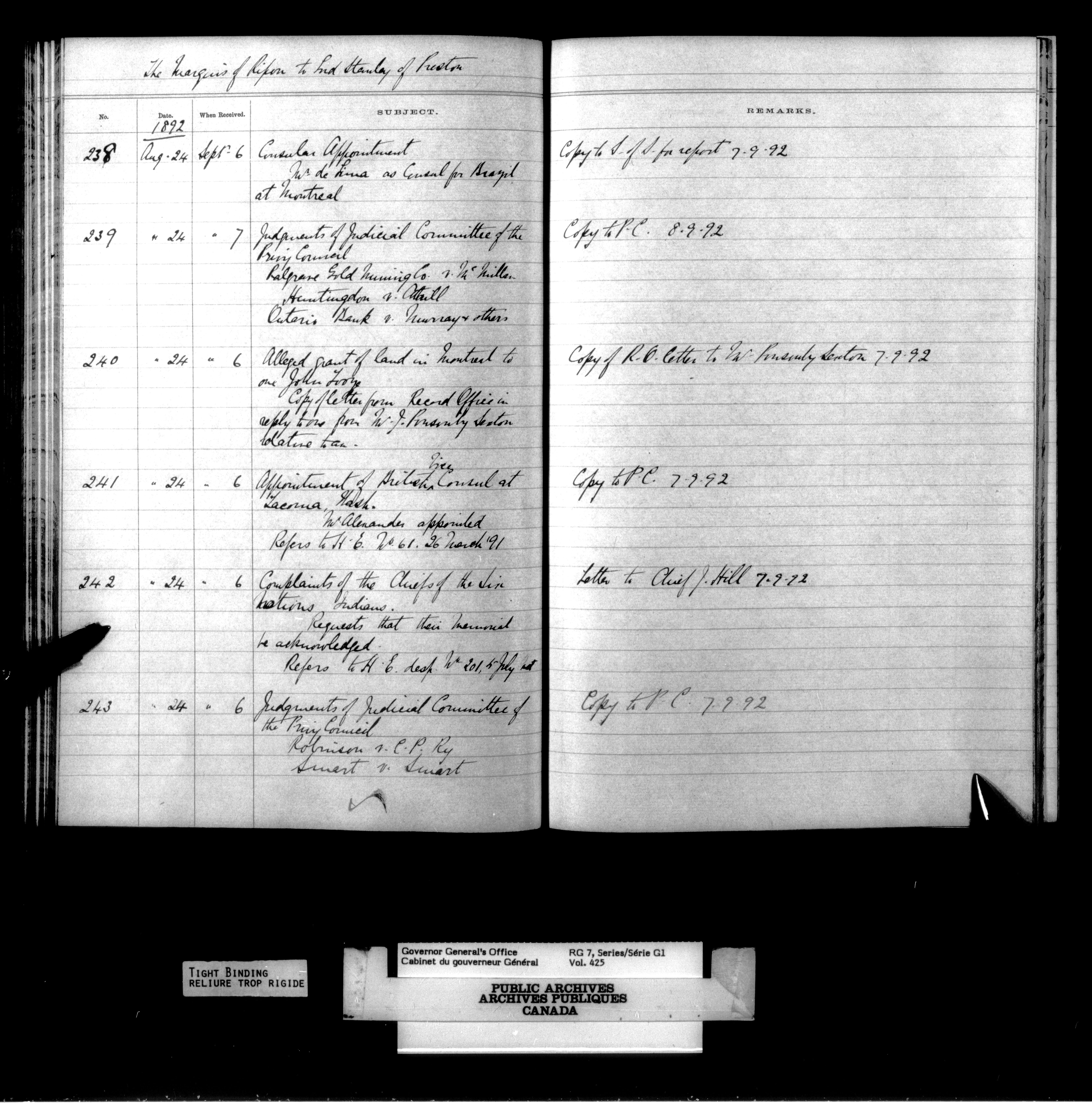 Governor General's Office Register of Despatches between the Colonial Office and the Governor General, 1885-1893 (Indexes) - 4166