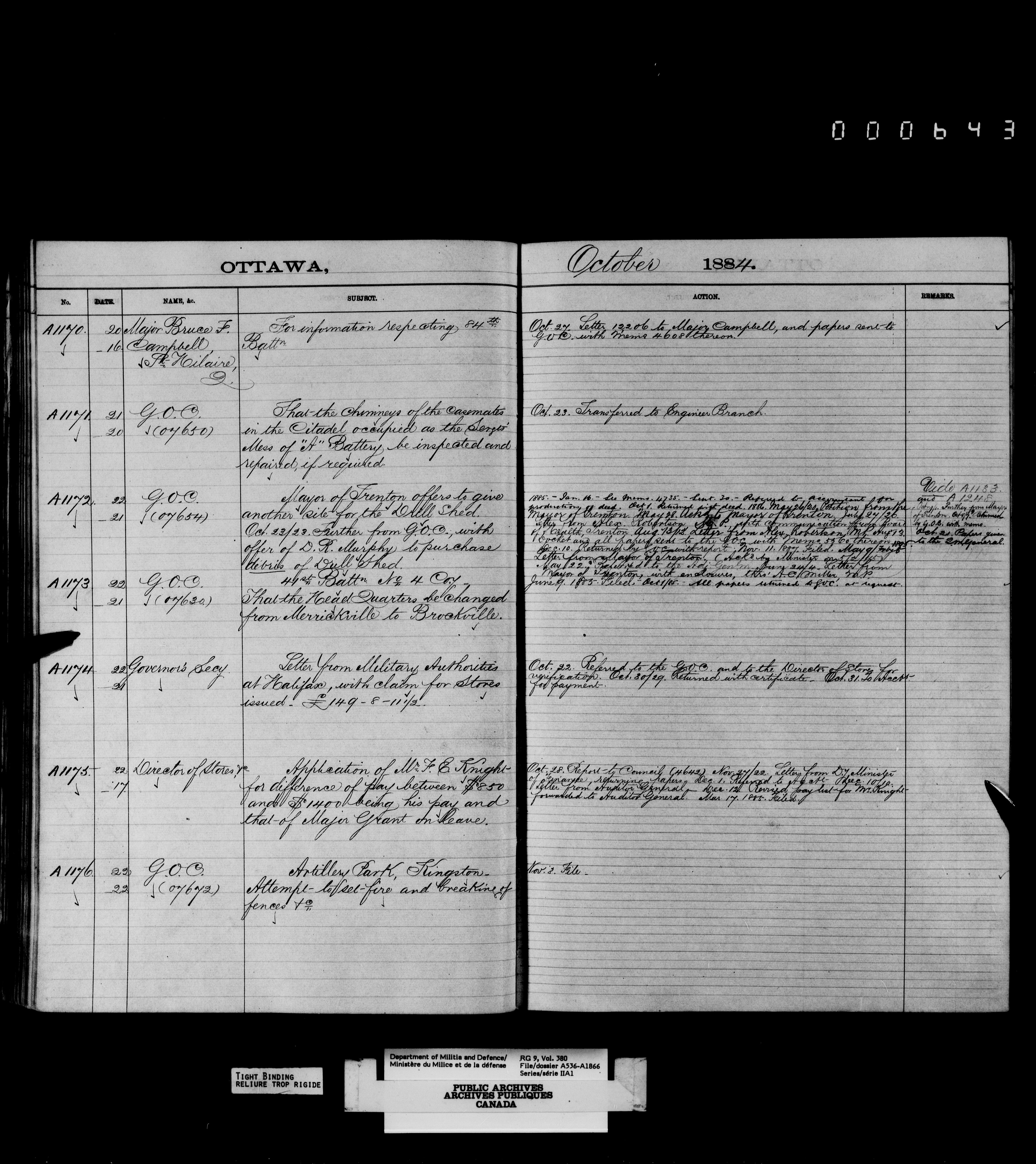 Department of Militia and Defence : Register of correspondence of the Deputy Minister's office, 1880-1885 - 4176