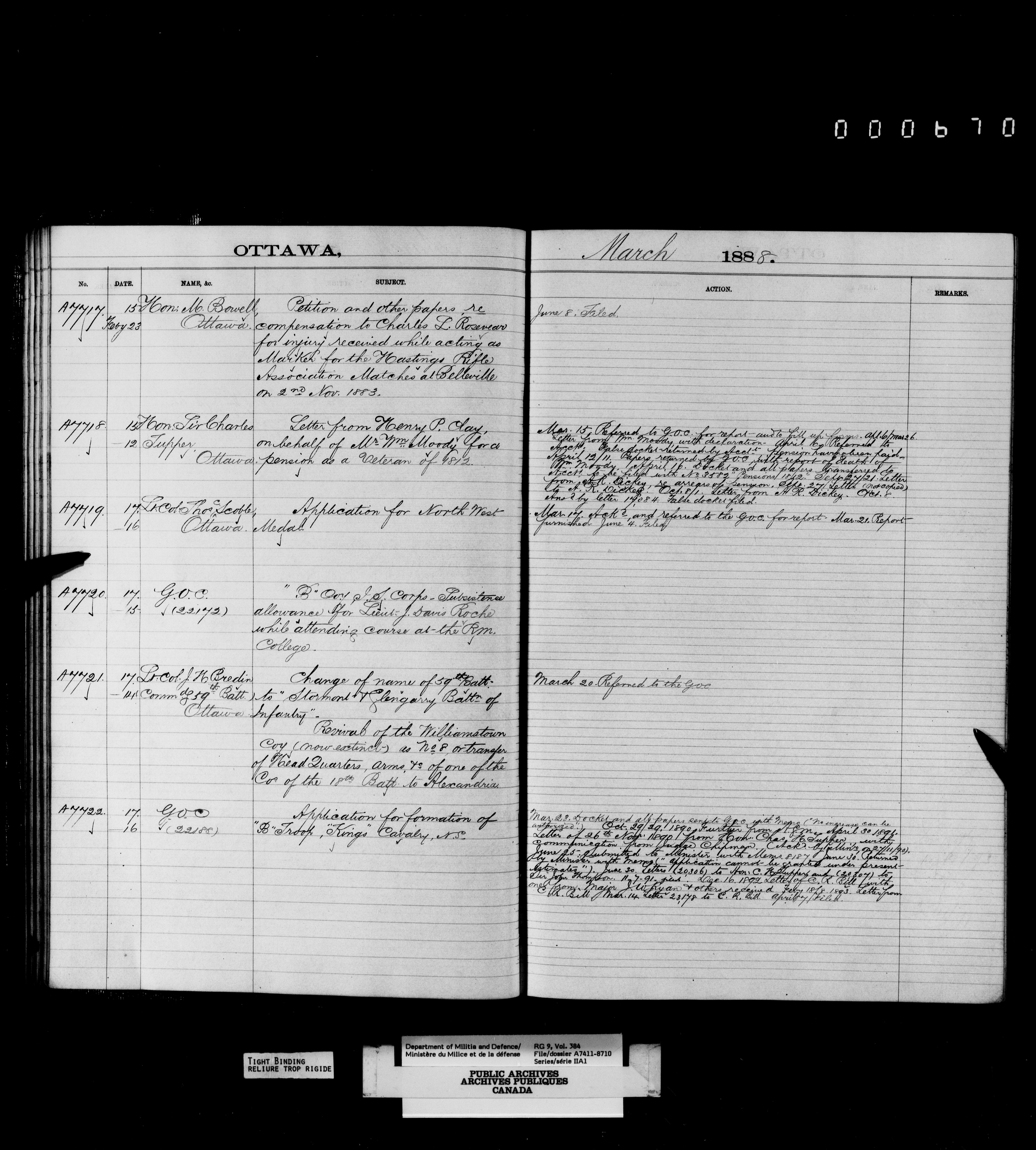 Department of Militia and Defence : Register of correspondence of the Deputy Minister's office, 1885-1889 - 4177
