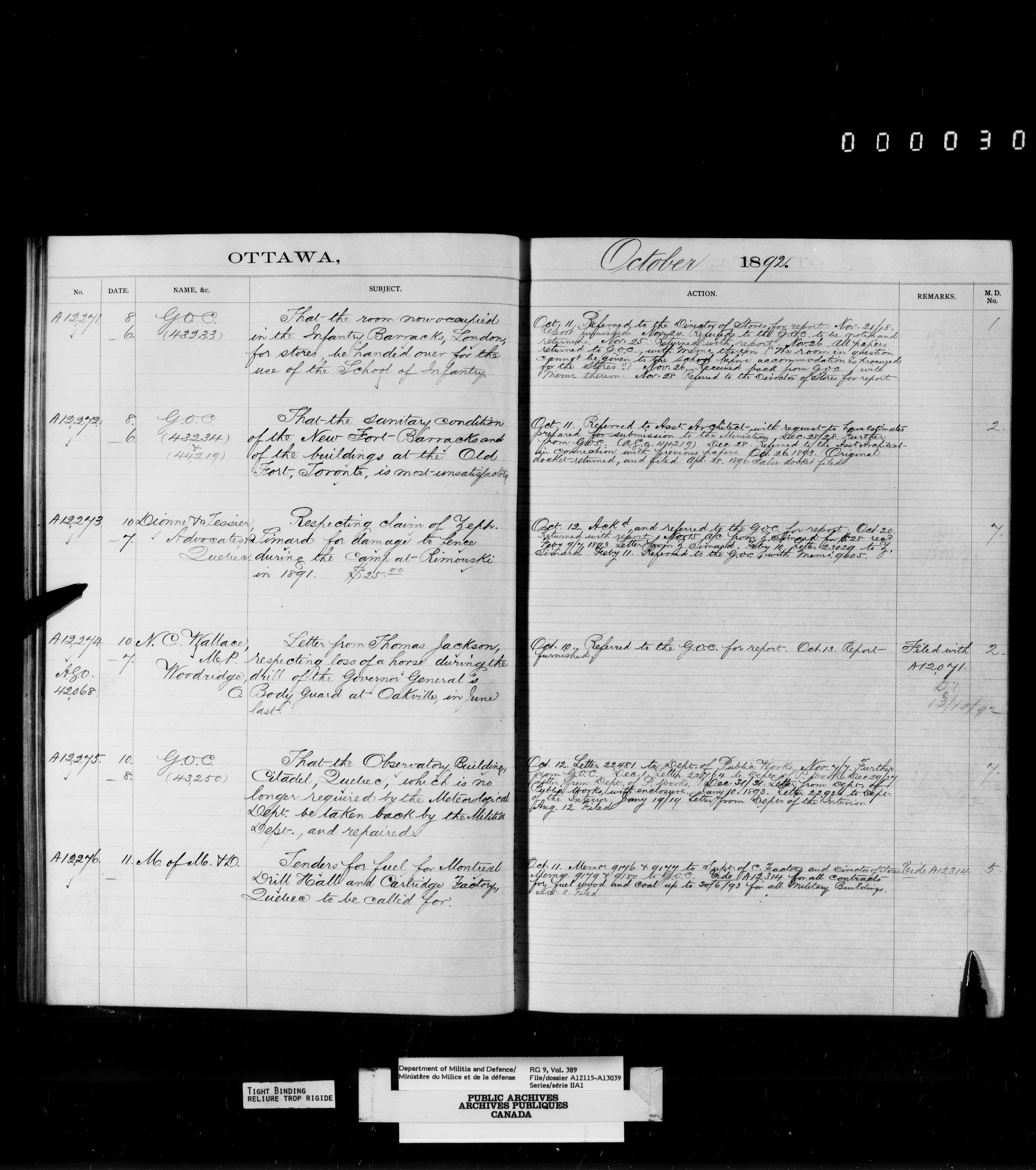 Department of Militia and Defence : Register of correspondence of the Deputy Minister's office, 1892 - 4179