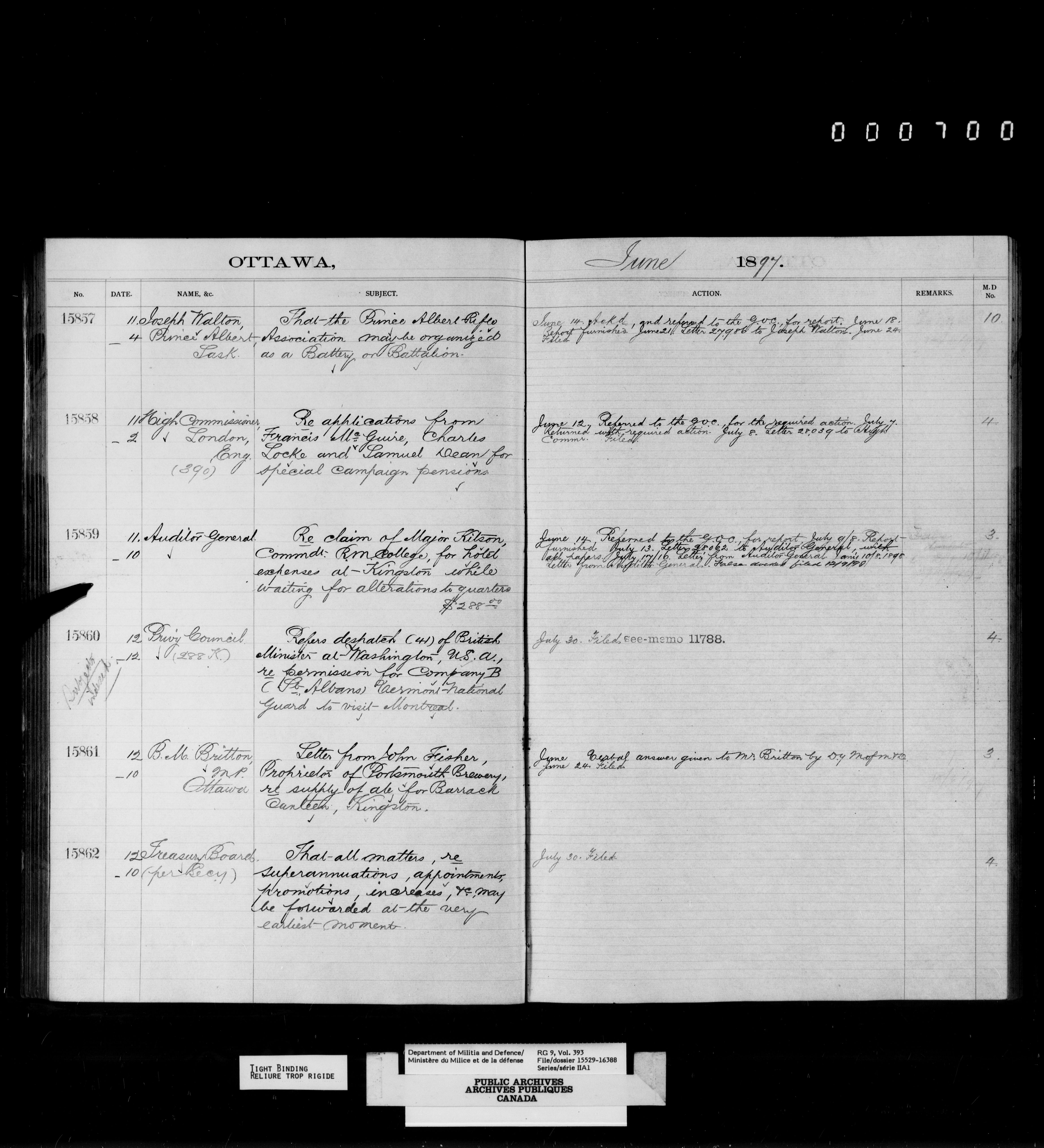 Department of Militia and Defence : Register of correspondence of the Deputy Minister's office, 1892 - 4179