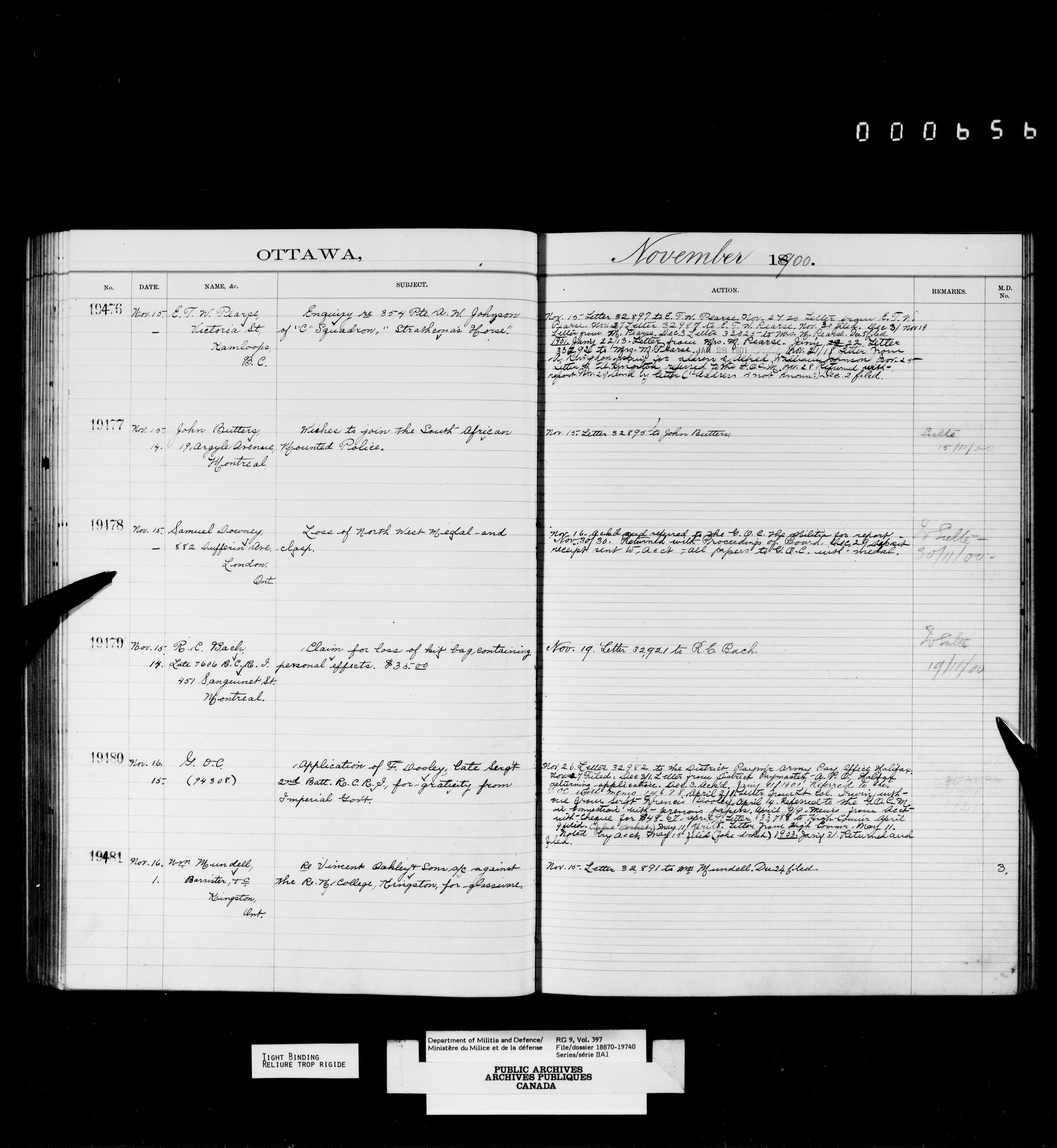 Department of Militia and Defence : Register of correspondence of the Deputy Minister's office, 1897-1901 - 4180