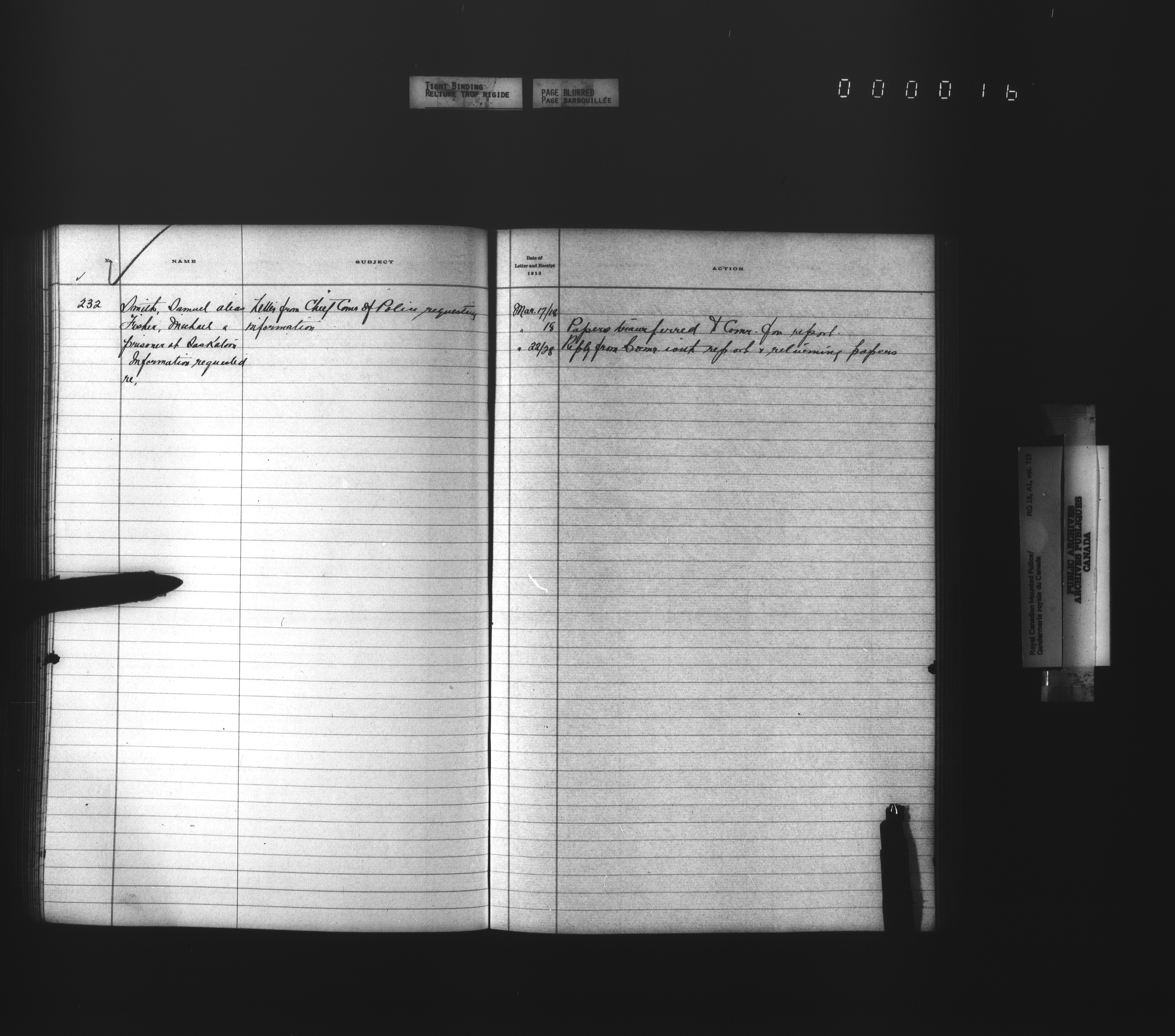 Royal Canadian Mounted Police, Office of the Comptroller, official correspondence : Indexes and registers - 4454