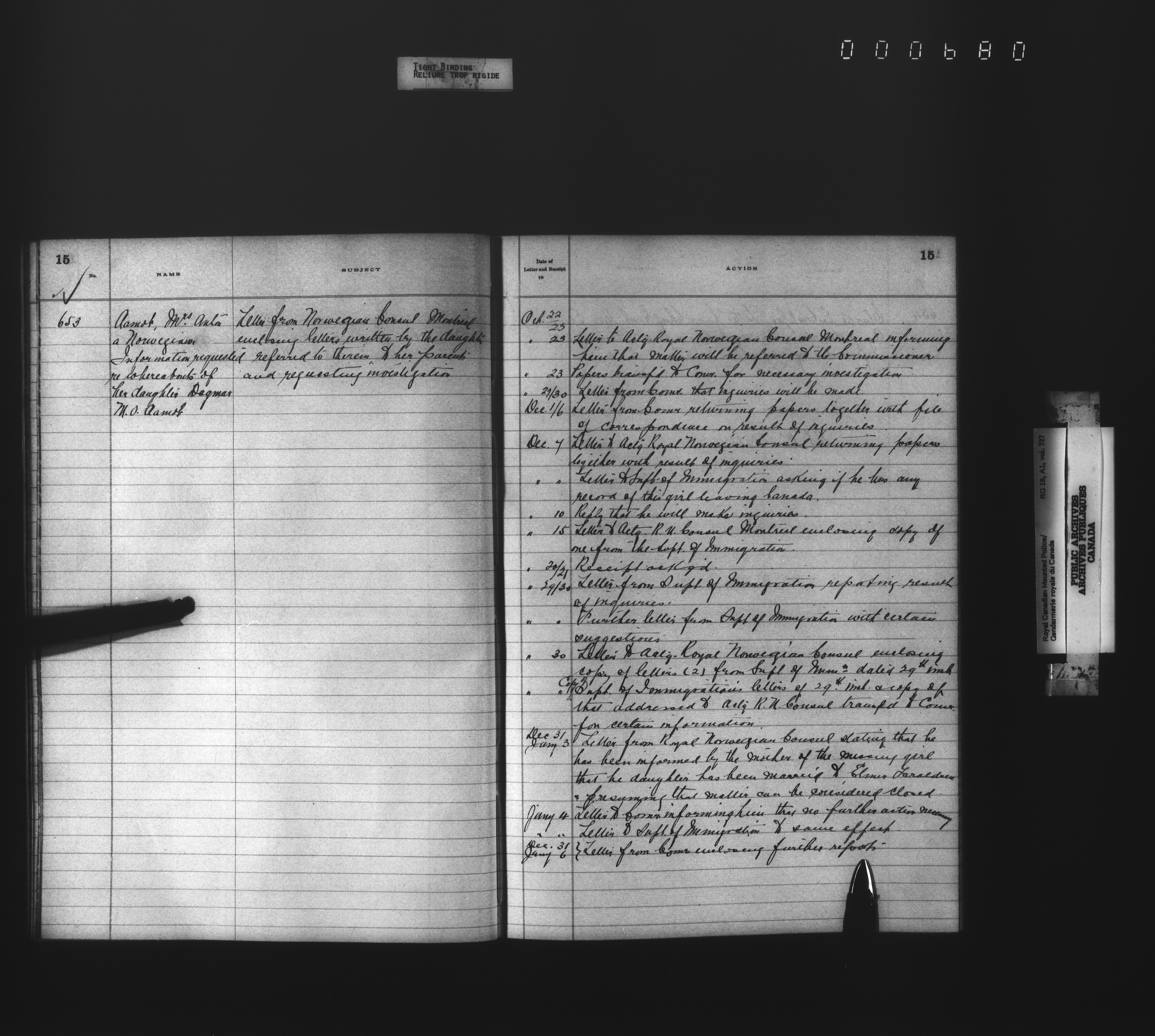 Royal Canadian Mounted Police, Office of the Comptroller, official correspondence : Indexes and registers - 4456