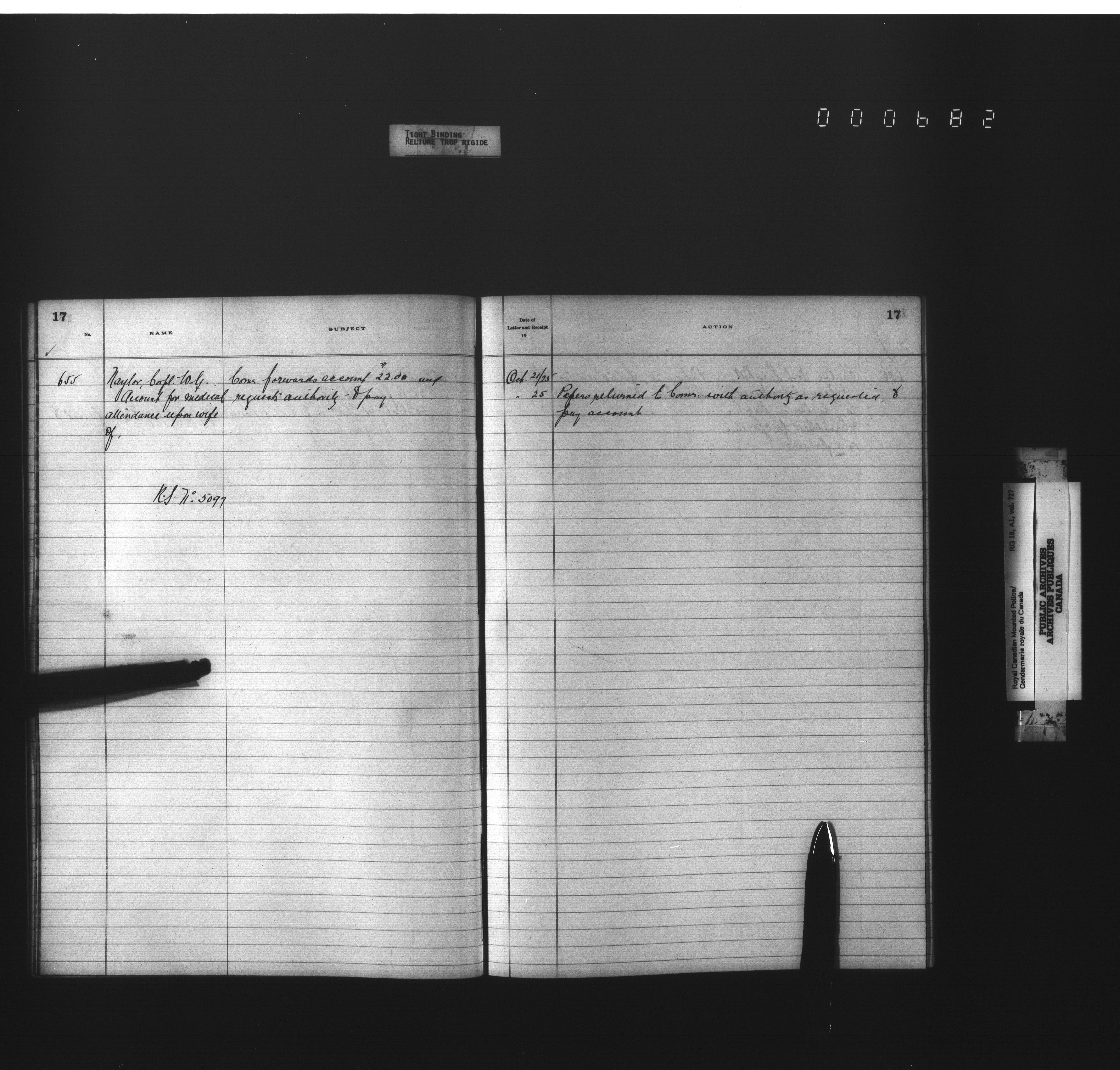 Royal Canadian Mounted Police, Office of the Comptroller, official correspondence : Indexes and registers - 4456