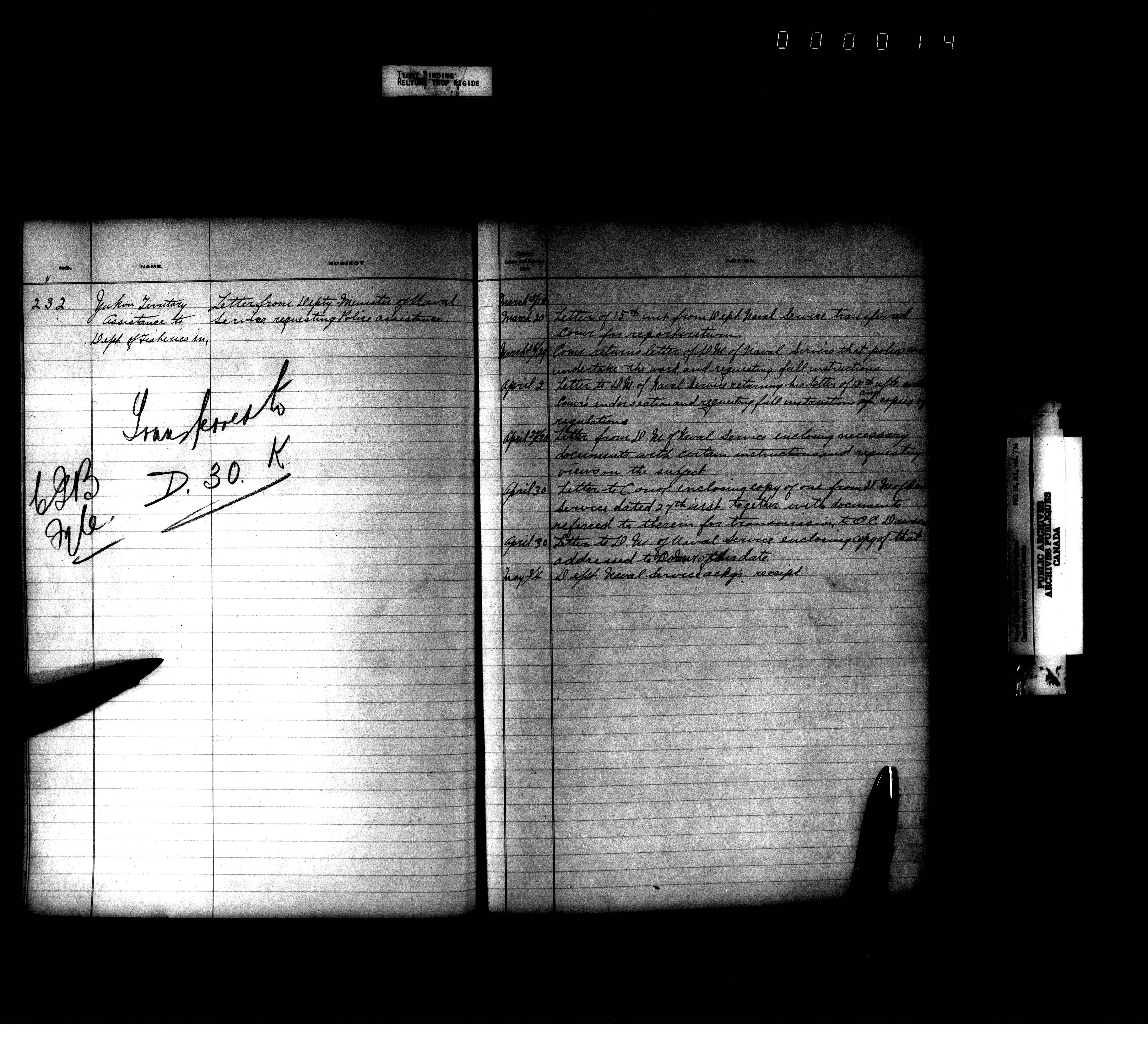 Royal Canadian Mounted Police, Office of the Comptroller, official correspondence : Indexes and registers - 4460